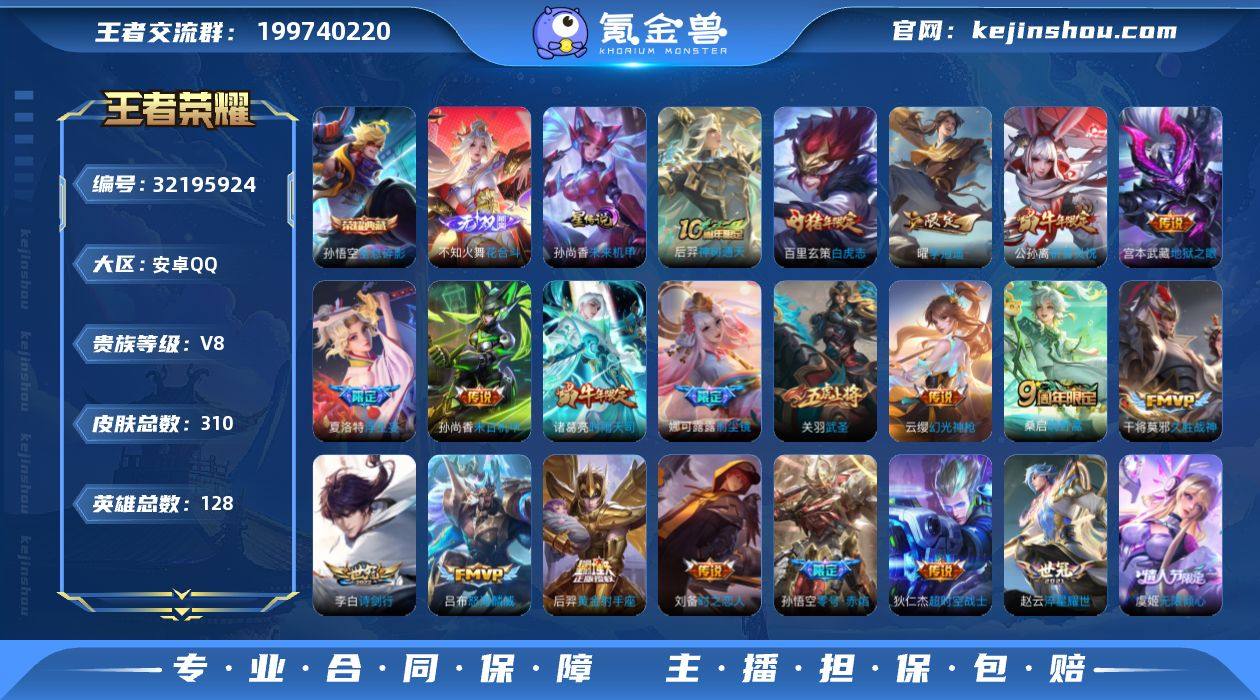 【高性价比·花合斗·全息碎影·李逍遥·浮生妄·祈雪灵祝·时雨天司·武圣·白虎志·挚爱之约·前尘镜·虞姬无限倾心·怒海麟威·碎云·诗剑行·可二次】YXw18378-安卓Q-128英雄-310皮肤-6王者印记-300铭文-贵族积分5w【贵族8】【1典藏·1无双·1星传说·24传说·8按键·261幸运值】【因赛季更新游戏段付以上号为准!】 【英雄全皮】:狂铁全皮,影全皮 【荣耀典藏】:孙悟空全息碎影 【无双皮肤】:不知火舞花合斗 【星元皮肤】:孙尚香未来机甲 【传说皮肤】:后羿神树通天,云缨幻光神枪,桑启鸣野蒿,夏洛特浮生妄,虞姬无限倾心,吕布怒海麟威,李白诗剑行,百里守约碎云,娜可露露前尘镜,孙策挚爱之约,赵云淬星耀世,曜李逍遥 ,公孙离祈雪灵祝,诸葛亮时雨天司,虞姬启明星使,孙悟空零号赤焰,关羽武圣,刘备时之恋人,干将莫邪久胜战神,百里玄策白虎志,后羿黄金射手座,孙尚香末日机甲,宫本武藏地狱之眼,狄仁杰超时空战士 【限定皮肤】:蒙犽顽岩魄,狄仁杰阴阳师,赵云皇家上将,嬴政白昼王子,孙尚香蔷薇恋人,鲁班七号狮舞东方,高渐离玩趣恶龙,钟无艳超时空战士,扁鹊奇幻香踪,白起夜都怪侠,芈月白晶晶,芈月幻夜卜梦,吕布猎兽之王,周瑜赤莲之焰,元歌云间偶戏,元歌无心,夏侯惇朔风刀,甄姬落雪兰心,曹操烛龙,马可波罗暗影游猎,狄仁杰魔术师,狄仁杰万华元夜,达摩星际陆战队,达摩沙漠行僧,项羽海滩派对,老夫子醍醐杖,关羽武圣,程咬金演武夺筹,韩信飞衡,韩信傲雪梅枪,王昭君午后时光,兰陵王驯魔猎人,兰陵王金庭之子,娜可露露前尘镜,亚瑟潮玩骑士王,孙悟空至尊宝,孙悟空零号赤焰,孙悟空孙行者,牛魔御旌,后羿如梦令,后羿圣弓游侠,刘备百相守梦,李元芳银河之约,李元芳云中旅人,虞姬启明星使,虞姬无限倾心,钟馗神迹守卫,钟馗驱傩正仪,杨玉环遇见飞天,杨戬潮玩骑兵,干将莫邪冰霜...