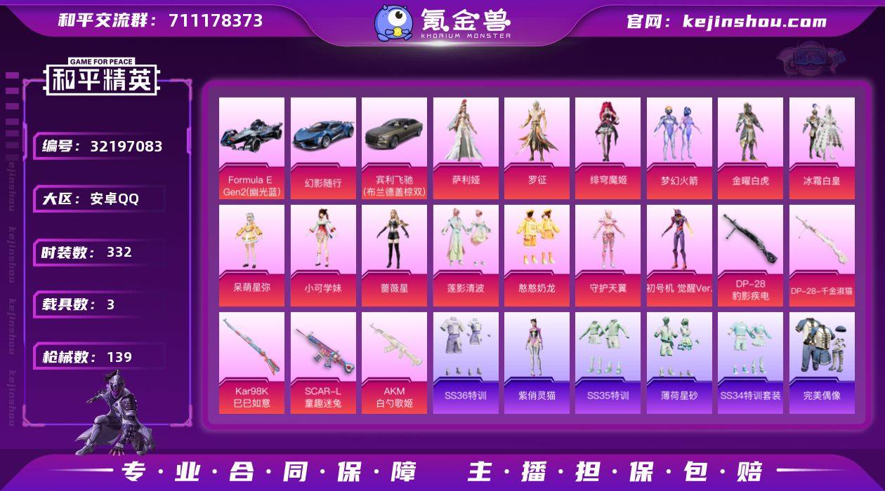 【新年特价出售】热力值:49860,收藏分:43483,13粉装,5粉枪,3载具,17粉色战备,95套装,139枪械,206装备,2滑翔尾翼,52降落伞,卓越收藏家:59级;等级:Lv.54 历史最高段位:传奇王牌13星 当前段位:英勇.黄金Ⅰ;王牌印记6次 卓越印记1次 传奇印记1次; 【热门品类】:套装-奇异狩猎者,角色-忠真马岱,角色-8号机,角色-Mark.06,撬棍-龙胆亮银枪;【粉色套装】:粉装-金曜白虎,粉装-梦幻火箭,粉装-冰霜白皇,角色-小可学妹,角色-呆萌星弥,角色-蔷薇星,粉装-莲影清波,粉装-憨憨奶龙,角色-守护天翼,角色-初号机觉醒Ver.,角色-绯穹魔姬,角色-萨利娅,角色-罗征;【粉色枪械】:AKM-白勺歌姬[7级],SCAR-L-童趣迷兔[7级],Kar98K-巳巳如意[5级],DP-28-豹影疾电[5级],DP-28-千金淑猫[1级];【粉色载具】:宾利飞驰(布罗德盖棕双色),FormulaEGen2(幽光蓝),幻影随行;【粉色滑翔尾翼】:炫彩糖果飞行器,天之羽翼飞行器;【粉色降落伞】:镜光幻境降落伞,异瞳寒姬降落伞,猪猪侠降落伞,初号机觉醒Ver.降落伞,金丰海韵降落伞,萌物绒绒降落伞,临安公主降落伞,白勺歌姬降落伞,星穹咏叹调降落伞,超新星降落伞,炫彩糖果降落伞,创世救赎降落伞,绯穹魔姬降落伞,月影灵韵降落伞,智耀战神降落伞