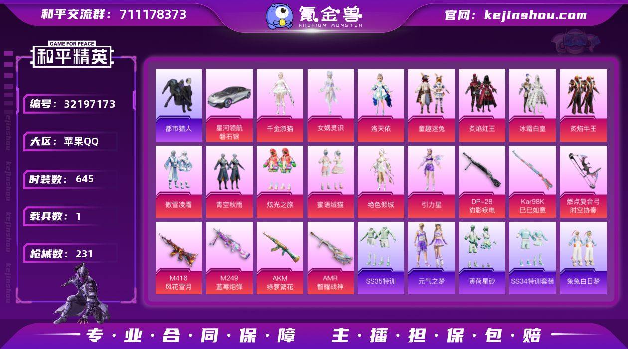【新年特价出售】热力值:79279,13粉装,8粉枪,1载具,28粉色战备,177套装,231枪械,346装备,7滑翔尾翼,85降落伞;等级:Lv.62 历史最高段位:卓越王牌12星 当前段位:坚韧.铂金Ⅴ;王牌印记14次 卓越印记1次; 【热门品类】:套装-都市猎人,套装-浪漫天命,套装-小丑鱼,角色-军刀雅典娜,套装-龟仙人,角色-Mark.06,浅蓝色牛仔衬衣;【粉色套装】:粉装-冰霜白皇,粉装-童趣迷兔,粉装-炙焰红王,角色-洛天依,粉装-炙焰牛王,粉装-傲雪凌霜,粉装-青空秋雨,粉装-炫光之旅,粉装-蜜语绒猫,角色-绝色倾城,角色-引力星,角色-千金淑猫,角色-女娲灵识;【粉色枪械】:AKM-绿萝繁花[5级],M416-风花雪月[7级],Kar98K-巳巳如意[5级],AMR-智耀战神[5级],Mk14-闲梦青缨[5级],M249-蓝莓炮弹[7级],DP-28-豹影疾电[5级],燃点复合弓-时空协奏[4级];【粉色载具】:星河领航(磐石银);【粉色滑翔尾翼】:庄周梦蝶飞行器,绯果甜心飞行器,天之羽翼飞行器,星夜魔法师飞行翼;【粉色降落伞】:异瞳寒姬降落伞,时光之吻降落伞,旋转彩虹降落伞,垂柳戏鸭降落伞,拳皇狂花道降落伞,暗夜鎏金降落伞,樱桃泡泡降落伞,太空嘟嘟降落伞,童趣迷兔降落伞,动力核心降落伞,晶梦幻蝶降落伞,暗夜玫瑰降落伞,飒粉甜心降落伞,鬼刀降落伞,海螺星光降落伞,橘柚倾心降落伞,阿狸红降落伞,春暖花开降落伞,闲梦青缨降落伞,千金淑猫降落伞,彩虹独角兽降落伞,歌者泠鸢降落伞,恐龙拽拽降落伞,创世救赎降落伞