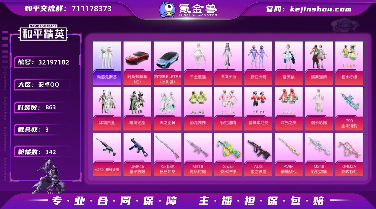 【新年特价出售】粉装数:14 特效枪数:315 粉枪数:12 载具数:3 套装数量:242 枪皮数量:342 粉色飞行器数量:6 热力值:115870 印记数:19 时装数:863 战备数:253 点券:4 段位:黄金 【王牌印记19次】 历史最高段位:【超级王牌】 【可排位】 【可二次实名】 【包人脸】【无换绑CD】 优质套装17 优质武器皮肤16 稀有载具3 稀有飞行器12 其他套装227 其他武器皮肤329 优质降落伞50 普通降落伞70 伙伴5 背包213 头盔181 动作15 优质套装:套装-小丑鱼,粉装-梦幻火箭,粉装-精灵迷巫,粉装-蝶舞迷情,套装-动感兔斯基人偶服,粉装-冰霜白皇,粉装-天之羽翼,粉装-香水柠檬,角色-洛天依,粉装-恐龙拽拽,粉装-彩虹甜喵,粉装-音爆索尼克,套装-龟仙人,粉装-炫光之旅,角色-烟云彩露,角色-千金淑猫,角色-冷漠罗丽; 优质武器皮肤:SCAR-L-锦绣绵绵,G36C-星穹咏叹调,AKM-绿萝繁花,GROZA-旋转彩虹,GROZA-香水柠檬,AUG-星之彼岸,M762-青锋波束,M416-电玩时刻,AWM-橘柚倾心,Kar98K-巳巳如意,Kar98K-星穹咏叹调,Kar98K-梦幻火箭,UMP45-量子极限,P90-金丰海韵,M249-彩虹甜喵,短管霰弹-星穹咏叹调; 稀有载具:仰望U7(阿盖尔紫),阿斯顿马丁DBS(红),路特斯ELETRE(冰川蓝); 稀有飞行器:紫色滑翔尾迹,神秘黑猫飞行器,红色滑翔尾迹,星之彼岸飞行器,梦幻火箭飞行器,冰柠泡泡飞行器,终晖之翼飞行器,异域银装飞行器,春暖花开飞行器,天之羽翼飞行器,破刃行动尾迹,光之冒险尾迹; 其他套装:套装-黄色伏地魔,套装-冰川格斗者,套装-竞技名士,套装-伏击者,套装-野性山猫,套装-长空猛禽,套装-竞技勇士朋克,套装-蓝色守护者,套装-海岛探路者,套装-旭日情侣,套装-冷焰舞者,套装-灼焰舞者,套装-特战装甲,套装-战地菁英,套装-贵族骑装,套装-特殊使命,套装-灰色格斗者,套装-活...