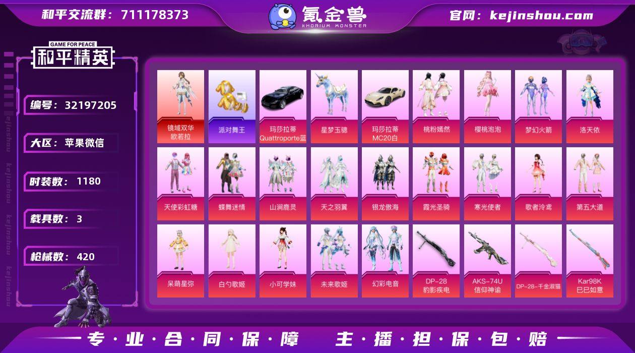【新年特价出售】热力值:150564,收藏分:118437,1神装,21粉装,14粉枪,3载具,38粉色战备,316套装,420枪械,535装备,19滑翔尾翼,130降落伞,绝世收藏家:90级;等级:Lv.73 历史最高段位:绝世王牌13星 当前段位:坚韧.铂金Ⅴ;王牌印记19次 卓越印记5次 传奇印记2次 绝世印记1次; 【热门品类】:镜域双华-欧若拉[5级],套装-SS1特训,套装-派对舞王,套装-忍者信条,套装-粉红小猪,套装-浪漫波比,套装-龟仙人,角色-Mark.06,小恶魔头饰,熔岩游骑兵面罩,熔岩游骑兵连帽夹克,绝对防御上衣;【红色套装】:镜域双华-欧若拉[5级];【粉色套装】:粉装-天使彩虹糖,粉装-梦幻火箭,粉装-蝶舞迷情,粉装-向日葵,粉装-山涧鹿灵,粉装-天之羽翼,角色-洛天依,粉装-银龙傲海,粉装-霞光圣骑,粉装-寒光使者,角色-歌者泠鸢,角色-小可学妹,角色-呆萌星弥,角色-白勺歌姬,粉装-第五大道,粉装-未来歌姬,粉装-桃粉嫣然,角色-樱桃泡泡,粉装-幻彩电音,角色-奇迹舞步美雪,角色-奇迹舞步雅雅;【粉色枪械】:SCAR-L-金蛇镇世[3级],AUG-暖羊咩咩[5级],AKM-炫紫旋律[4级],M416-五爪金龙[7级],Kar98K-巳巳如意[5级],Kar98K-圣域龙灵[1级],M24-镜域双华[3级],Mk14-樱桃泡泡[7级],Mk14-精灵梦叶罗丽[1级],AKS-74U-信仰神谕[5级],DP-28-千金淑猫[3级],DP-28-豹影疾电[5级],MG3-洛神天依[4级],烟雾弹-电雾迷城[5级];【粉色载具】:星梦玉骢,玛莎拉蒂Quattroporte(夜幕蓝),玛莎拉蒂MC20(星石白);【粉色滑翔尾翼】:歌者泠鸢飞行器,镜域双华-灵镜之阶,万象金身飞行器,太空嘟嘟飞行器,炫彩糖果飞行器,幽焰列车飞行器[1级],深渊漩涡飞行器,提桶跑路飞行器,星夜魔法师飞行翼;【粉色降落伞】:齐天大圣降落伞,潮汐统领降落伞,奇迹舞步降落伞,白勺歌姬降落伞,锦绣火鲤降落伞,梦幻火...