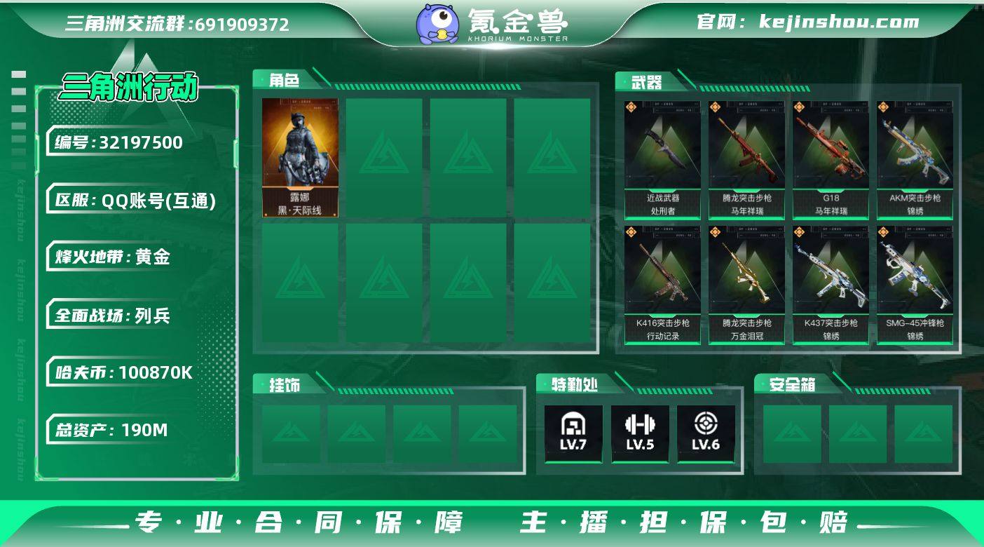 190m总资产-100870k哈伏币-60烽火等级-黄金-12战场等级-列兵【干员外观】:露娜-黑·天际线【近战皮肤】:近战-处刑者,近战-黑鹰【传说外观】:M4A1突击步枪-蚀金玫瑰,M4A1突击步枪-阿米娅,AKM突击步枪-锦绣,ASh-12战斗步枪-鹅鸭杀,K416突击步枪-行动记录,AK-12突击步枪-特斯拉线圈,SCAR-H战斗步枪-启航,CAR-15突击步枪-阿米娅,腾龙突击步枪-捞点薯条,腾龙突击步枪-马年祥瑞,腾龙突击步枪-万金泪冠,K437突击步枪-锦绣,UZI冲锋枪-特斯拉线圈,SMG-45冲锋枪-骑士,SMG-45冲锋枪-锦绣,SR-3M紧凑突击步枪-特斯拉线圈,勇士冲锋枪-能天使-午夜邮差,勇士冲锋枪-万金泪冠,QCQ171冲锋枪-鹅鸭杀,QJB201轻机枪-鹅鸭杀,AWM狙击步枪-捞点薯条,AWM狙击步枪-万金泪冠,G18-马年祥瑞,93R-捞点薯条,复合弓-黑·天际线【史诗外观】:AKM突击步枪-林中猎手,QBZ95-1突击步枪-曙光,K416突击步枪-阿萨拉特攻,M16A4突击步枪-竞赛选手,AUG突击步枪-蝮蛇,M7战斗步枪-禁卫,SG552突击步枪-深海恐惧,SG552突击步枪-哈夫克警备,SCAR-H战斗步枪-囚徒,G3战斗步枪-哈夫克警备,MP5冲锋枪-深海恐惧,SR-3M紧凑突击步枪-战术竞备,勇士冲锋枪-深海恐惧,MP7冲锋枪-六套之力,QCQ171冲锋枪-禁卫,M1014霰弹枪-林中猎手,S12K霰弹枪-曙光,PKM通用机枪-蝮蛇,M250通用机枪-囚徒,SVD狙击步枪-阿萨拉工艺,SVD狙击步枪-暗夜猎手,M14射手步枪-禁卫,SV-98狙击步枪-林中猎手,SV-98狙击步枪-囚徒,SV-98狙击步枪-猎鳄行动,M700狙击步枪-竞技风,M700狙击步枪-蝮蛇,M700狙击步枪-哈夫克警备,沙漠之鹰-曙光【稀有外观】:QBZ95-1突击步枪-医疗协议,AKS-74U突击步枪-前沿科技,ASh-12战斗步枪-星链科技,ASh-12战斗步枪-哈夫克航天,M7战斗步枪-捣蛋鬼,SCAR-H战斗步枪-童趣,SCAR-H战斗步枪-荣耀列队,PTR-32突击步枪-天...