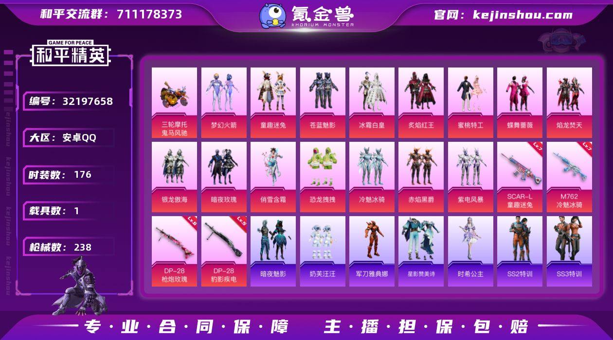 安卓 手Q-15粉装-5特效枪-1载具-3粉色飞行器-73374热力值-3王牌印记-176套装-238枪皮 【热门品类】:粉装-梦幻火箭,粉装-童趣迷兔,角色-军刀雅典娜 【粉色套装】:粉装-梦幻火箭,粉装-苍蓝魅影,粉装-冰霜白皇,粉装-童趣迷兔,粉装-炙焰红王,粉装-蜜桃特工,粉装-蝶舞蔷薇,粉装-焰龙焚天,粉装-银龙傲海,粉装-暗夜玫瑰,粉装-俏雪含霜,粉装-恐龙拽拽,粉装-冷魅冰骑,粉装-赤焰黑爵,粉装-紫电风暴 【粉色枪皮等级】:SCAR-L-童趣迷兔(七级),M762-冷魅冰骑(七级),Mk14-福马献瑞(五级),DP-28-枪炮玫瑰(六级),DP-28-豹影疾电(五级) 【粉色载具】:鬼马风驰 【粉色枪皮】:SCAR-L-童趣迷兔,M762-冷魅冰骑,Mk14-福马献瑞,DP-28-枪炮玫瑰,DP-28-豹影疾电 【粉色飞行器】:炫彩糖果飞行器,梦幻火箭飞行器,枪炮玫瑰飞行器 【粉色降落伞】:梦幻火箭降落伞,四圣焕新降落伞,童趣迷兔降落伞,王牌四分卫降落伞,怪笑疯兔降落伞,烈焰拳霸降落伞,枪炮玫瑰降落伞,焰龙焚天降落伞,暗夜玫瑰降落伞,林间仙鹿降落伞,洛神天依降落伞,恐龙拽拽降落伞,冷魅冰骑降落伞,精灵梦叶罗丽降落伞,炫彩糖果降落伞 【稀有套装】:套装-炫彩糖果,套装-星影赞美诗,角色-时希公主 【稀有枪皮】:AKM-四圣焕新,AKM-彩虹符号,AKM-星之彼岸,AKM-灼热熔岩,AKM-玉龙,AKM-生命誓言,AKM-萌趣颜团子,AKM-虎虎生威,AKM-霓虹街区,M16A4-幻世战舞者,M16A4-甜心亚梦,M16A4-红色方程式,SCAR-L-夜灯,SCAR-L-幽秘魅影,SCAR-L-暗夜玫瑰,SCAR-L-炫彩节奏,SCAR-L-玉兔迎春,SCAR-L-红色方程式,M416-夜灯,M416-梨园星光,M416-神秘黑猫,M416-绯红前夜,M416-蓝色火焰,GROZA-异彩先驱,GROZA-彩虹符号,GROZA-林间仙鹿,GROZA-梨园星光,GROZA-治愈之星,GROZA-田园牧歌,GROZA-黑色刀锋,AUG-幻影战神,AUG-怪笑疯...