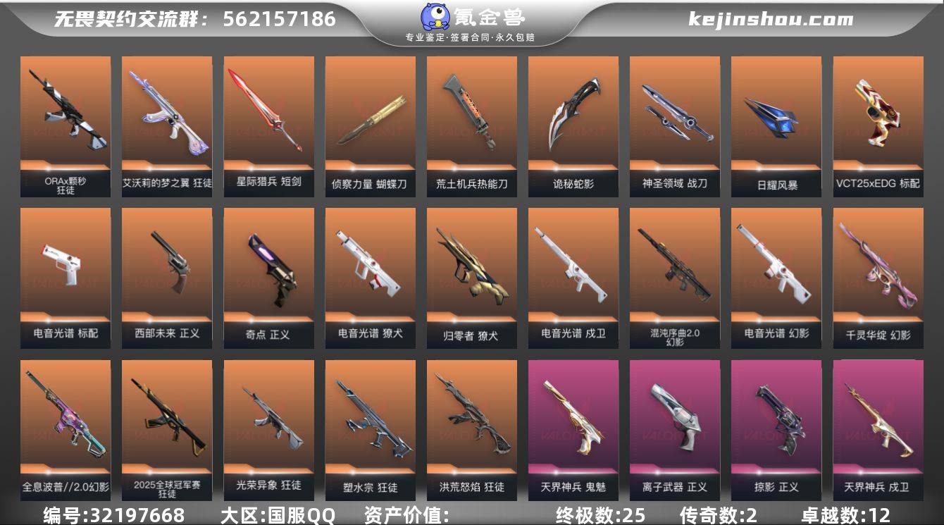 【套装】:电音光谱套装 【英雄】:幻棱,炼狱,维斯,暮蝶,钛狐,壹决,铁臂,捷风,雷兹,幽影,不死鸟,贤者,猎枭,蝰蛇,零,芮娜,奇乐,尚勃勒,霓虹,斯凯,夜露,星礈,K/O,海神,盖可,黑梦,钢锁 【近战武器】:近战武器-碎心裂刃,近战武器-谐波音谱,近战武器-侦察力量 蝴蝶刀,近战武器-紫金爪刀,近战武器-鬼丸国纲,近战武器-荒土机兵 热能刀,近战武器-诡秘蛇影 军刀,近战武器-神圣领域 战刀,近战武器-日耀风暴 遗器,近战武器-星际猎兵 短剑 【狂徒】:狂徒-2025全球冠军赛,狂徒-洪荒怒焰,狂徒-塑水宗,狂徒-光荣异象,狂徒-ORA x 颗秒,狂徒-艾沃莉的梦之翼,狂徒-盖世英雄,狂徒-盖亚的复仇,狂徒-紫阙金琅,狂徒-离子武器//2.0,狂徒-荒土机兵,狂徒-诡秘蛇影 【幻影】:幻影-千灵华绽,幻影-全息波普//2.0,幻影-电音光谱,幻影-混沌序曲//2.0,幻影-般若假面,幻影-侦察力量,幻影-神圣领域,幻影-纳米打击,幻影-末日之翼,幻影-电音光谱 【戍卫】:戍卫-电音光谱,戍卫-天界神兵,戍卫-逆冲蛮牛,戍卫-月球哨兵,戍卫-折光棱晶,戍卫-电音光谱 【獠犬】:獠犬-归零者,獠犬-电音光谱,獠犬-神圣领域,獠犬-逆冲蛮牛,獠犬-电音光谱 【冥驹】:冥驹-堕天遗武,冥驹-起源,冥驹-荒土机兵,冥驹-星云暗涌 【飞将】:飞将-末日之翼 【莽侠】:莽侠-诡秘蛇影,莽侠-月球哨兵 【战神】:战神-神圣领域 【奥丁】:奥丁-纳米打击,奥丁-末日之翼 【判官】:判官-诡秘蛇影,判官-纳米打击x 【雄鹿】:雄鹿-逆冲蛮牛,雄鹿-月球哨兵 【骇灵】:骇灵-荒土机兵,骇灵-星云暗涌 【蜂刺】:蜂刺-星云暗涌,蜂刺-折光棱晶 【标配】:标配-电音光谱,标配-超能偶像,标配-荒土机兵,标配-折光棱晶,标配-电音光谱 【VCT手枪】:标配-VCT25 x EDG 【正义】:正义-奇点,正义-西部未来,正义-掠影,...