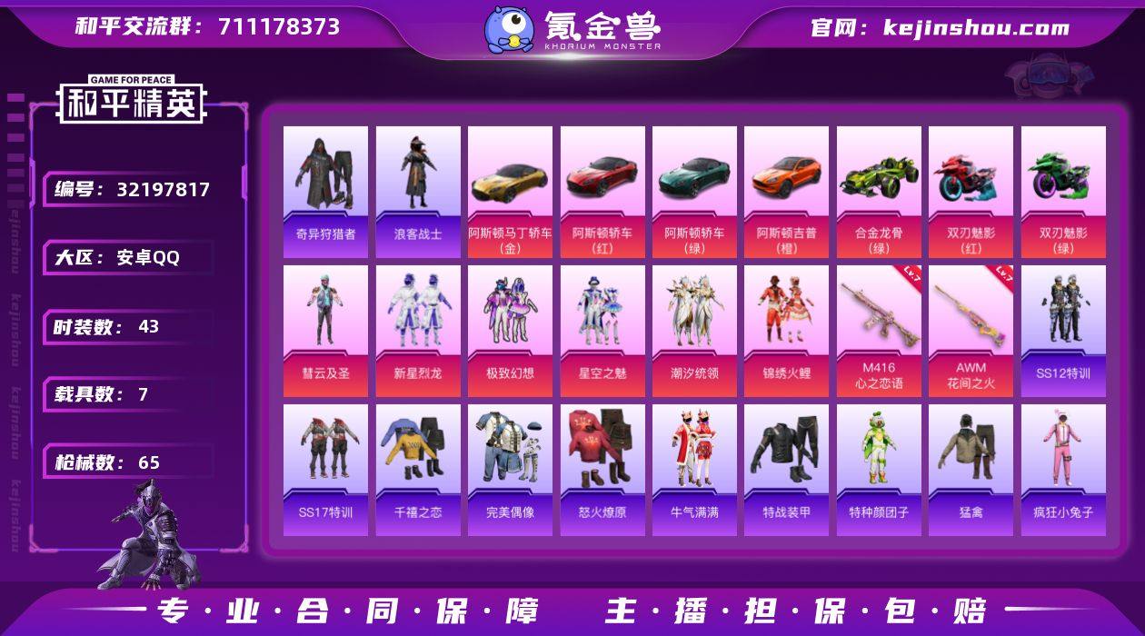 安卓 手Q-6粉装-2特效枪-7载具-5粉色飞行器-42066热力值-2王牌印记-43套装-65枪皮【热门品类】:套装-奇异狩猎者,套装-浪客战士【粉色套装】:粉装-彗云及圣,粉装-新星烈龙,粉装-极致幻想,粉装-星空之魅,粉装-潮汐统领,粉装-锦绣火鲤【粉色枪皮等级】:M416-心之恋语(七级),AWM-花间之火(七级)【粉色载具】:阿斯顿马丁DBS(红),阿斯顿马丁DBS(绿),阿斯顿马丁DBS(金),阿斯顿马丁DBX(橙),合金龙骨(绿),双人摩托-双刃魅影(红),双人摩托-双刃魅影(绿),空客H135-蔚蓝之翼【粉色枪皮】:M416-心之恋语,AWM-花间之火【粉色飞行器】:伏魔团飞行器,心之恋语飞行翼,马卡龙飞行器,锦绣火鲤飞行器,荧光虫舞飞行器【粉色降落伞】:伏魔团降落伞,四圣焕新降落伞,马卡龙降落伞,花间之火降落伞,锦绣火鲤降落伞,荧光虫舞降落伞【稀有套装】:套装-雪国风尚【稀有枪皮】:AKM-四圣焕新,AKM-萌趣颜团子,AKM-锦绣火鲤,M16A4-快乐主宰,M16A4-红色方程式,SCAR-L-浪客战士,SCAR-L-红色方程式,M416-红色方程式,GROZA-春暖花开,GROZA-马卡龙,QBZ-原初圣火,M762-奇异狩猎者,M762-牛气冲天,M762-镭射皇者,G36C-花间之火,UZI-红色方程式,Vector-治愈之星,汤姆逊-花间之火,野牛-机械英豪,Kar98K-古堡领主,Kar98K-炫彩节奏,Kar98K-童话森林,Kar98K-马卡龙,M24-治愈之星,SKS-心之恋语,SKS-浪客战士,VSS-镭射皇者,Mini14-原初圣火,Mini14-炫彩节奏,Mini14-耀粉歌者,Mini14-马卡龙,Win94-机械英豪,SLR-四圣焕新,QBU-锦绣火鲤,S686-浪客战士,S1897-镭射皇者,S12K-机械英豪,M249-四圣焕新,M249-破晓战魂,M249-镭射皇者,DP-28-原初圣火,DP-28-锦绣火鲤,MG3-第五大道,P18C-原初圣火【其他套装】:套装-SS12特训,套装-SS17特训,套装-千禧之恋,套装-完美偶像,套装...