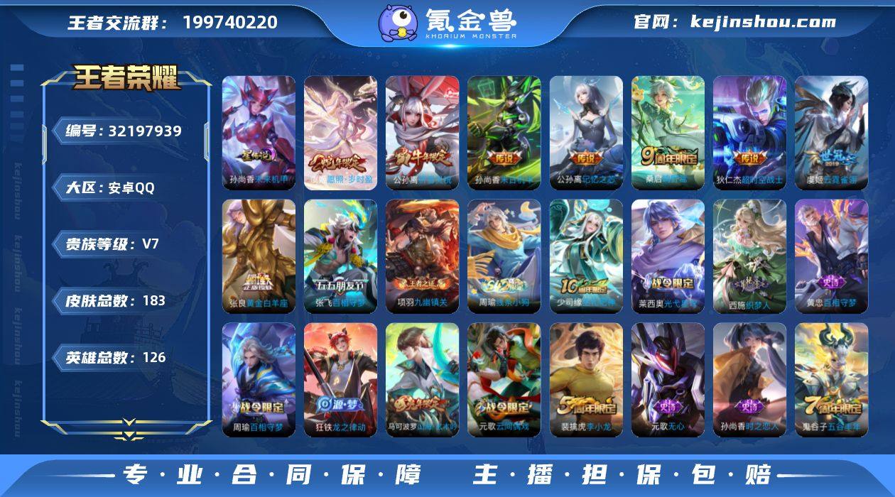 【YX957】贵族7/皮肤183/传说9/史诗48/英雄126/鬼谷子全皮/空空儿全皮/未来机甲/愿照·岁时盈/鸣野蒿/百相守梦(张飞)/记忆之芯/祈雪灵祝/黄金白羊座/云霓雀翎/末日机甲-孙尚香/超时空战士-狄仁杰/阴阳师/皇家上将/蔷薇恋人/高山流水/云间偶戏/无心/山海·玄木吟/魔术师/万华元夜(s22)/沙漠行僧(s26)/海滩派对/醍醐杖(s20)/金庭之子(s27)/云中旅人(s29)/黎明之约/原初探秘者(s21)/五谷丰年/千军破阵(s25)/大漠名商(s28)/疑决卦(s19)/李小龙/擒涛扼浪(s31)/梁祝/探海日志(s32)/海盐诗旅(s30)/流音漫舞/鬼谷子天穹祈灯(S34)/剑破天穹(s35)/熔金海岸/噬灭天穹(s37)/谧流熔炉/虚灵犬护/逆浪荇歌/荣光之誓/九幽镇关/百相守梦-周瑜/百相守梦-孙策/光弋星穹/往忆晖光/线条小狗-周瑜/巫礼祀神/织梦人/百相守梦-黄忠/龙之律动/星界特工/电玩·爆裂旋风/乐园奇幻夜/龙鼓争鸣/时之恋人-孙尚香/无限星赏官/鹰眼统帅/箭羽风息/猫狗日记-大乔/功夫厨神/逐浪之夏/舞动绿茵/特工魅影/心灵骇客/缤纷独角兽/乘风破浪/德古拉伯爵/水晶猎龙者/乱世虎臣/幽灵船长/绅士熊喵/圣诞狂欢/金属风暴/魅力维加斯/摇滚巨星/水果甜心/鬼剑武藏/地狱岩魂/偶像歌手/圣诞恋歌/谜偶窥秘/鹤鸣心笺/罗小黑战记/克喵/踏浪烽翎/戏梦巡演/死霸装/命运加冕/灵野札记/春野闲踪/星梦巡礼/雪境奇遇-西施/铁骨偃魂/苍林狼骑/雾都夜雨/功夫炙烤/朵莉亚金色潮汐/劲辣红锅/潮玩探月行/危途狂花/胡桃狂想曲/唤灵魔甲/无双福将/潮玩牛仔/乓乓大师/缤纷绘卷/秘密基地/圆桌骑士(盾山)/次元突破/炽热元素使/鲨炮海盗猫/归虚梦演-蒙犽/虹云星官/守护之力/坚韧之力/幻乐之宴/掌控之力/沉稳之力/制霸全明星/功夫老勺/命运角斗场/幻想奇妙夜/海滩丽影/龙腾万里/阿尔法小队/花好人间/五福同心/兔女郎/拳王/死亡骑士/时尚教父/天使之翼/玩偶对对碰/西部大镖客(牛魔)/白色死神/红...
