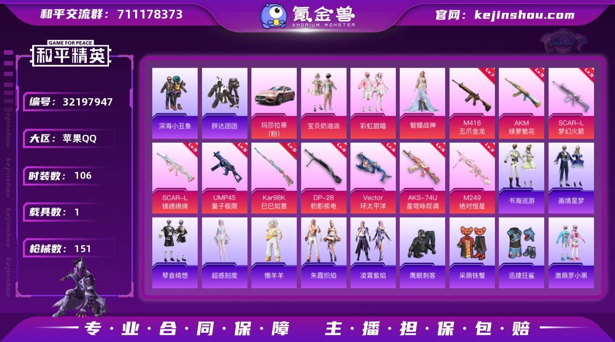 苹果 手Q-3粉装-11特效枪-1载具-1粉色飞行器-47938热力值-11王牌印记-106套装-151枪皮 【热门品类】:套装-浪漫天命,套装-深海小丑鱼,套装-小丑鱼,套装-胖达团团,套装-星河浪客,套装-粉红小猪,角色-8号机,角色-Mark.06 【粉色套装】:粉装-宝贝奶油派,粉装-彩虹甜喵,角色-智耀战神 【粉色枪皮等级】:AKM-绿萝繁花(五级),SCAR-L-梦幻火箭(五级),SCAR-L-锦绣绵绵(五级),M416-五爪金龙(七级),UMP45-量子极限(五级),Vector-环太平洋(四级),AKS-74U-星穹咏叹调(四级),Kar98K-巳巳如意(五级),Mk14-福马献瑞(三级),M249-绝对恒星(三级),DP-28-豹影疾电(四级) 【粉色载具】:玛莎拉蒂Ghibli(粉) 【粉色枪皮】:AKM-绿萝繁花,SCAR-L-梦幻火箭,SCAR-L-锦绣绵绵,M416-五爪金龙,UMP45-量子极限,Vector-环太平洋,AKS-74U-星穹咏叹调,Kar98K-巳巳如意,Mk14-福马献瑞,M249-绝对恒星,DP-28-豹影疾电 【粉色飞行器】:炫彩糖果飞行器 【粉色降落伞】:绝对恒星降落伞,童趣迷兔降落伞,环太平洋降落伞,垂柳戏鸭降落伞,音爆索尼克降落伞,圣堂之誓降落伞,异瞳寒姬降落伞,炫彩糖果降落伞 【稀有套装】:角色-超感刻度,套装-雪国风尚,套装-炫彩糖果,套装-速跑银狼,套装-青团波波,套装-燕燕于飞,套装-鱼渊荷华,套装-镭金极速,套装-朱霞炽焰,套装-凌霄紫焰,玩偶服-懒羊羊,套装-书海巡游,套装-画境星梦,套装-琴音绮想 【稀有枪皮】:AUG-冰晶雪宝,AKM-环太平洋,AKM-缤纷海域,M16A4-甜心亚梦,SCAR-L-炫彩节奏,SCAR-L-玉兔迎春,M416-蓝色火焰,AUG-天降萌叽,AUG-海螺星光,AUG-耀粉歌者,AUG-绝对恒星,QBZ-彩虹符号,M762-诡娃娃,AC-VAL-天降萌叽,AC-VAL-快闪甜心,AC-VAL-甜心亚梦,蜜獾-娇憨猪猪,ACE32-画境星梦,ARX-凌霄紫焰,UZI-啾咪啾咪,UZI-娇憨猪猪,UZI-影袭,UZI-...