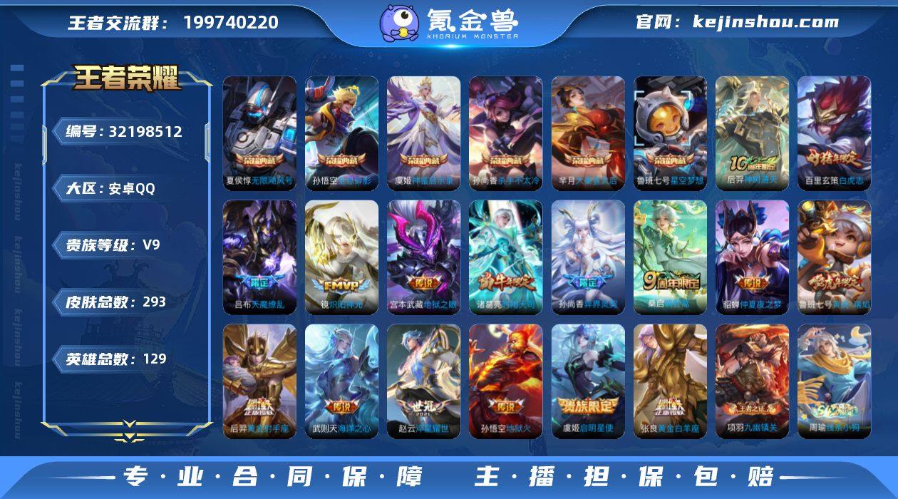 (6614)精致男神号实名: 可修改 贵族等级: V9 英雄数: 129 皮肤数: 293 荣耀水晶: 武则天,星空梦想,无限飓风号,杀手不太冷,大秦宣太后,全息碎影,神鉴启示录 传说皮: 黄金射手座,黄金白羊座,炽阳神光,地狱火,仲夏夜之梦,海洋之心,地狱之眼,淬星耀世,神树通天 限定皮: 冰锋战神,遇见飞天,李小龙,梁祝,时雨天司,烈魂,异界灵契-孙尚香,玄嵩,天魔缭乱,幽恒,白虎志,玄武志,至尊宝,如梦令-后羿,寅虎·瑞焰,霸王别姬-项羽,高山流水,孙行者,猪悟能,女儿国国王,百木心枪,五谷丰年,鸣野蒿