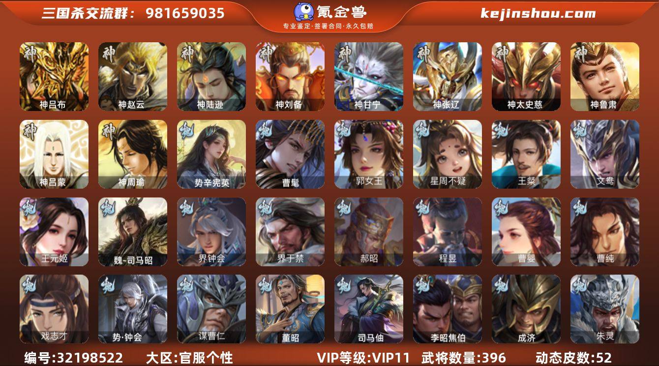 VIP等级: VIP11 官阶: 大将军 武将数量: 396 动态皮肤数量: 52 神将: 神甘宁,神刘备,神陆逊,神吕布,神太史慈,神张辽,神赵云,神吕蒙,神周瑜,神鲁肃 魏国武将: 戏志才,曹纯,曹婴,程昱,郝昭,界于禁,界钟会,魏-司马昭,王元姬,文鸯,王粲,唐咨-魏,张辽,SP蔡文姬,SP关羽,SP贾诩,SP姜维,SP庞德,卞夫人,蔡贞姬,曹昂,曹操,曹冲,曹洪,曹丕,曹仁,曹叡,贾逵,王异,张恭,鲁芝,界满宠,曹休,界曹植,满宠,荀攸,钟繇,郭嘉,牵招,荀彧,阮慧,杜畿,界郭嘉,崔琰,界曹丕,界荀彧,朱灵,界王异,界许褚,界郭淮,华歆,陈群,界邓艾,界典韦,界曹休,袁涣,乐进,辛宪英,谋曹仁,郭淮,毛玠,郭皇后,夏侯惇,曹植,司马朗,谋于禁,界曹操,星周不疑,许褚,界张辽,谋徐晃,张郃,钟会,文聘,郭女王,曹彰,界夏侯惇,诸葛诞,司马懿,甄姬,杨阜,界徐晃,徐晃,韩浩史涣,胡班,曹真,典韦,界夏侯渊,夏侯渊,李典,于禁,王双,邓艾,界司马懿,张春华,孟达-魏,臧霸,牛金,朱灵(国战),曹髦,成济,李昭焦伯,司马伷,董昭,势辛宪英,势钟会 蜀国武将: 董允,关索,花鬘,界黄忠,谯周,沙摩柯,张星彩,诸葛瞻,谋马超,谋赵云,马云騄,徐庶,界魏延,吕凯,界关羽,界诸葛亮,邓芝,界伊籍,费祎,严颜,界黄月英,界张嶷,赵云,张松,彭羕,李丰,界刘备,界刘禅,谋姜维,刘封,糜竺,李遗,谋庞统,黄月英,刘巴,关羽,王甫赵累,吴懿,界吴懿,祝融,张飞,黄皓,陈震,魏延,界周仓,马忠,界法正,糜夫人,刘禅,界赵云,界姜维,关银屏,SP孙尚香,SP徐庶,卧龙诸葛,周仓,简雍,界关兴张苞,诸葛亮,界张飞,界卧龙诸葛,法正,界简雍,陈到,界马岱,关平,马岱,界庞统,庞统,诸葛果,谋张飞,马谡,马超,霍峻,来敏,廖化,关兴张苞,谋关羽,孟获,夏侯氏,姜维,黄忠,刘备,界马超,李严,马良,傅肜,蒋琬费祎,刘谌,彭羕(国战),甘夫人,蜀-糜芳傅士仁,SP甘夫人,势魏延,势陈到,势陈祗 吴国武将: 贺齐,界步练师,界徐盛,留赞,骆统,孙寒华,文鸯,界朱桓,潘濬,张温,周...