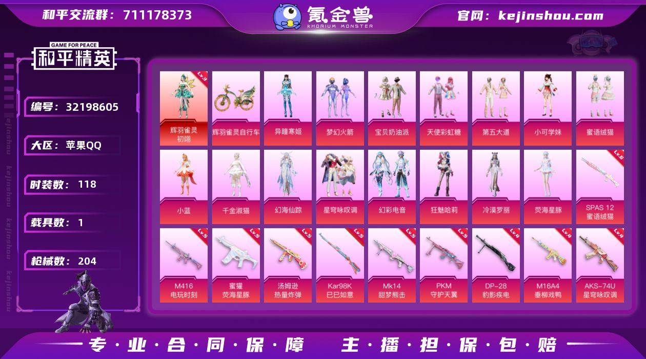 【kyhp115】苹果 手Q-1神装-15粉装-15特效枪-1载具-9粉色飞行器-69741热力值-9王牌印记-118套装-204枪皮 【红色神装等级】:辉羽雀灵-初翊(三级) 【红色角色神装】:辉羽雀灵-初翊 【热门品类】:粉装-梦幻火箭,套装-浪漫天命,套装-龟仙人,套装-暗影哥特,套装-糯粉咩咩,角色-8号机 【粉色套装】:粉装-宝贝奶油派,粉装-天使彩虹糖,粉装-梦幻火箭,粉装-第五大道,角色-小可学妹,粉装-蜜语绒猫,角色-小蓝,角色-千金淑猫,角色-幻海仙踪,粉装-星穹咏叹调,粉装-幻彩电音,角色-狂魅哈莉,角色-冷漠罗丽,角色-荧海星豚,角色-异瞳寒姬 【粉色枪皮等级】:M16A4-垂柳戏鸭(四级),M416-电玩时刻(五级),蜜獾-荧海星豚(五级),Vector-最终圣卫者(三级),汤姆逊-热量炸弹(五级),AKS-74U-星穹咏叹调(四级),Kar98K-巳巳如意(五级),Mk14-甜梦熊击(五级),AMR-智耀战神(四级),SPAS-12-蜜语绒猫(六级),DP-28-千金淑猫(四级),DP-28-豹影疾电(四级),MG3-辉羽雀灵(三级),PKM-守护天翼(五级),MG-36-幻彩电音(四级) 【粉色载具】:辉羽雀灵自行车 【粉色枪皮】:M16A4-垂柳戏鸭,M416-电玩时刻,蜜獾-荧海星豚,Vector-最终圣卫者,汤姆逊-热量炸弹,AKS-74U-星穹咏叹调,Kar98K-巳巳如意,Mk14-甜梦熊击,AMR-智耀战神,SPAS-12-蜜语绒猫,DP-28-千金淑猫,DP-28-豹影疾电,MG3-辉羽雀灵,PKM-守护天翼,MG-36-幻彩电音 【粉色飞行器】:天之羽翼飞行器,镜光幻境飞行翼,镜域双华-灵镜之阶,绝色倾城飞行器,星空武士飞行器,脆鲨七海飞行器,雀灵庇佑飞行器,终晖之翼飞行器 【粉色降落伞】:春暖花开降落伞,梦幻火箭降落伞,环太平洋降落伞,垂柳戏鸭降落伞,蜜语绒猫降落伞,镜域双华降落伞,辉耀战甲降落伞,江南烟雨降落伞,精灵梦叶罗丽降落伞,守护天翼降落伞,千金淑猫降落伞,月影灵韵降落伞,晶...