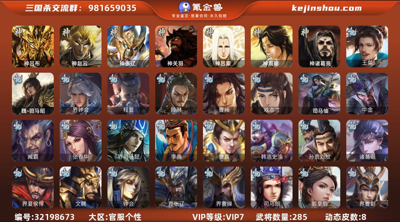 VIP等级:VIP7 官阶:骠骑将军 史诗武将数量:17 动态皮肤数量:8 宝珠数量:0 元宝数量:3740 将魂数量:2642 雁翎数量:20328 心愿积分数量:2557 欢乐豆数量:129 金票数量:994 卖家说:司马昭加白马皮肤