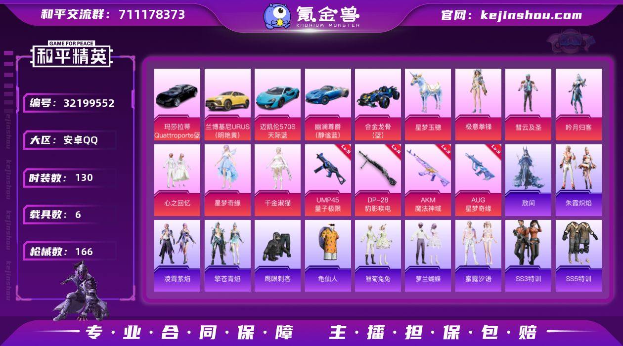 安卓 手Q-6粉装-5特效枪-6载具-2粉色飞行器-54799热力值-11王牌印记-130套装-166枪皮 【热门品类】:套装-龟仙人 【粉色套装】:粉装-彗云及圣,粉装-吟月归客,粉装-心之回忆,角色-星梦奇缘,角色-千金淑猫,粉装-极意拳锋 【粉色枪皮等级】:AKM-魔法神域(三级),AUG-星梦奇缘(三级),UMP45-量子极限(五级),Mk14-福马献瑞(五级),DP-28-豹影疾电(四级) 【粉色载具】:兰博基尼URUS(明艳黄),玛莎拉蒂Quattroporte(夜幕蓝),迈凯伦570S(天际蓝),幽澜尊爵(静谧蓝),合金龙骨(蓝),星梦玉骢 【粉色枪皮】:AKM-魔法神域,AUG-星梦奇缘,UMP45-量子极限,Mk14-福马献瑞,DP-28-豹影疾电 【粉色飞行器】:炫彩糖果飞行器,风花雪月飞行器 【粉色降落伞】:垂柳戏鸭降落伞,未来歌姬降落伞,星梦奇缘降落伞,金丰海韵降落伞,千金淑猫降落伞,炫彩糖果降落伞 【稀有套装】:套装-龟仙人,套装-雪国风尚,套装-炫彩糖果,套装-雏菊兔兔,套装-萝兰蝴蝶,套装-蜜露汐语,套装-朱霞炽焰,套装-凌霄紫焰,套装-擎苍青焰,角色-敖闰 【稀有枪皮】:AUG-冰晶雪宝,AKM-夜灯,AKM-生命誓言,AKM-破晓战魂,AKM-龙的传人,M16A4-红色方程式,M16A4-蓝色火焰,M16A4-千金淑猫,SCAR-L-暗夜玫瑰,SCAR-L-玉兔迎春,SCAR-L-红色方程式,M416-红色方程式,M416-蓝色火焰,GROZA-黑色刀锋,AUG-天降萌叽,AUG-耀粉歌者,QBZ-彩虹符号,QBZ-银碳小老虎,M762-天降萌叽,M762-拳皇97,M762-牛气冲天,M762-瑞龙福将,Mk47-妙红点点,G36C-暗夜玫瑰,AC-VAL-天降萌叽,蜜獾-娇憨猪猪,ARX-凌霄紫焰,UZI-娇憨猪猪,UZI-影袭,UZI-炫彩节奏,UZI-红色方程式,UMP45-夜灯,UMP45-蓝色火焰,Vector-黑色刀锋,汤姆逊-天降萌叽,汤姆逊-幻影战神,汤姆逊-耀粉歌者,汤姆逊-像素花束,MP5K-飒粉甜心,JS9-凌霄紫焰,Kar98K-六...