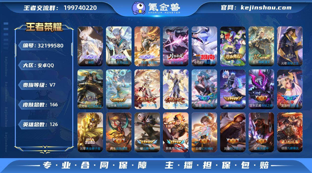 安卓Q-V7-最强王者段位-126英雄-166皮肤-3无双-3珍品传说-18传说-46史诗【英雄全皮】:孙权全皮,空空儿全皮,影全皮【无双皮肤】:铠神罪,诸葛亮天机白泽,曜器灵螭龙剑【珍品传说】:暃朽木白哉,孙策时之奇旅,马可波罗怪盗基德【传说皮肤】:狄仁杰神骥赴朔漠,后羿神树通天,元歌诡秘之主,大司命死亡执政官,公孙离云诺千山,司空震愿照山河定,澜愿照九州拓,云缨幻光神枪,裴擒虎祥瑞亨通,亚连落雪白狼,典韦战鼓燎原,澜逐花归海,夏洛特浮生妄,铠绛天战甲,曜云鹰飞将,刘备时之恋人,达摩黄金狮子座,宫本武藏地狱之眼【限定皮肤】:狄仁杰阴阳师,赵云皇家上将,阿轲迷踪丽影,元歌无心,马可波罗暗影游猎,狄仁杰魔术师,项羽海滩派对,百里玄策原初追逐者,夏洛特浮生妄,亚连落雪白狼【年限皮肤】:司空震愿照山河定,澜愿照九州拓【赛季限定】:东皇太一噬灭天穹,太乙真人谧流熔炉,钟馗虚灵犬护,甄姬逆浪荇歌,亚瑟荣光之誓,百里玄策原初追逐者,项羽九幽镇关【战令限定】:阿轲迷踪丽影,马可波罗暗影游猎,百里守约百相守梦,老夫子百相守梦,孙膑茶境仙,马超访茗客,刘禅鸭鸭历险记,沈梦溪鸭鸭历险记,周瑜百相守梦,孙策百相守梦,莱西奥光弋星穹,明世隐往忆晖光,周瑜线条小狗,小乔线条小狗【史诗皮肤】:周瑜线条小狗,小乔线条小狗,项羽九幽镇关,少司缘巫礼祀神,女娲万灵启世,莱西奥光弋星穹,西施织梦人,黄忠百相守梦,周瑜百相守梦,百里守约雪豹霜爪,狂铁龙之律动,刘禅鸭鸭历险记,阿轲化蝶舞,赵怀真器灵浮梦炉,弈星万物之道,姬小满飞车小橘子,孙膑茶境仙,百里守约百相守梦,马可波罗星界特工,元歌无心,澜赏金猎手,杨戬天秀启明,百里玄策热力回旋,百里玄策原初追逐者,马可波罗暗影游猎,孙尚香时之恋人,马超神威,阿轲迷踪丽影,公孙离无限星赏官,狄仁...