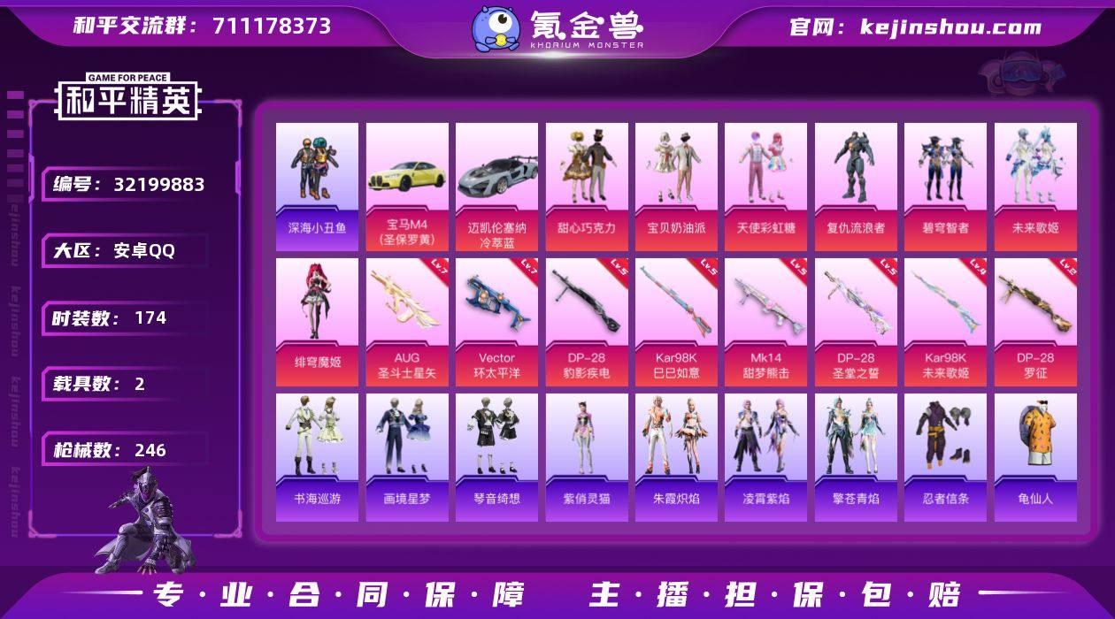 安卓 手Q-7粉装-11特效枪-2载具-2粉色飞行器-78681热力值-17王牌印记-174套装-246枪皮 【热门品类】:套装-深海小丑鱼,套装-忍者信条,套装-龟仙人,套装-暗影哥特 【粉色套装】:粉装-甜心巧克力,粉装-宝贝奶油派,粉装-天使彩虹糖,角色-复仇流浪者,粉装-碧穹智者,粉装-未来歌姬,角色-绯穹魔姬 【粉色枪皮等级】:AUG-圣斗士星矢(七级),UMP45-萌骑冒险(一级),Vector-环太平洋(七级),AKS-74U-森灵之息(五级),Kar98K-未来歌姬(四级),Kar98K-巳巳如意(五级),Mk14-甜梦熊击(五级),Mk14-福马献瑞(五级),DP-28-圣堂之誓(五级),DP-28-罗征(二级),DP-28-豹影疾电(五级) 【粉色载具】:宝马M4(圣保罗黄),迈凯伦塞纳(冷萃蓝) 【粉色枪皮】:AUG-圣斗士星矢,UMP45-萌骑冒险,Vector-环太平洋,AKS-74U-森灵之息,Kar98K-未来歌姬,Kar98K-巳巳如意,Mk14-甜梦熊击,Mk14-福马献瑞,DP-28-圣堂之誓,DP-28-罗征,DP-28-豹影疾电 【粉色飞行器】:炫彩糖果飞行器,超新星飞行器 【粉色降落伞】:甜心宝贝降落伞,洛神天依降落伞,碧影闪光降落伞,恐龙拽拽降落伞,冷魅冰骑降落伞,环太平洋降落伞,暗夜鎏金降落伞,第五大道降落伞,莲影清波降落伞,守护天翼降落伞,拳皇·狂花道降落伞,千金淑猫降落伞,智耀战神降落伞,星穹咏叹调降落伞,幻彩电音降落伞,喜羊羊与灰太狼降落伞,炫彩糖果降落伞 【稀有套装】:套装-龟仙人,套装-巳巳如意,套装-雪国风尚,套装-炫彩糖果,套装-顽皮橙,套装-马上来财,套装-雏菊兔兔,套装-萝兰蝴蝶,套装-小熊娃娃,套装-糖糖葫芦,套装-青团波波,套装-棉花软糖,角色-都市丽猫,角色-怀庆长公主,套装-燕燕于飞,套装-鱼渊荷华,套装-樱梦幻音,套装-星渊小夜曲,套装-极速光影,套装-彩虹兔,套装-云朵鹅,套装-雪绒豹,套装-朱霞炽焰,套装-凌霄紫焰,套装-擎...