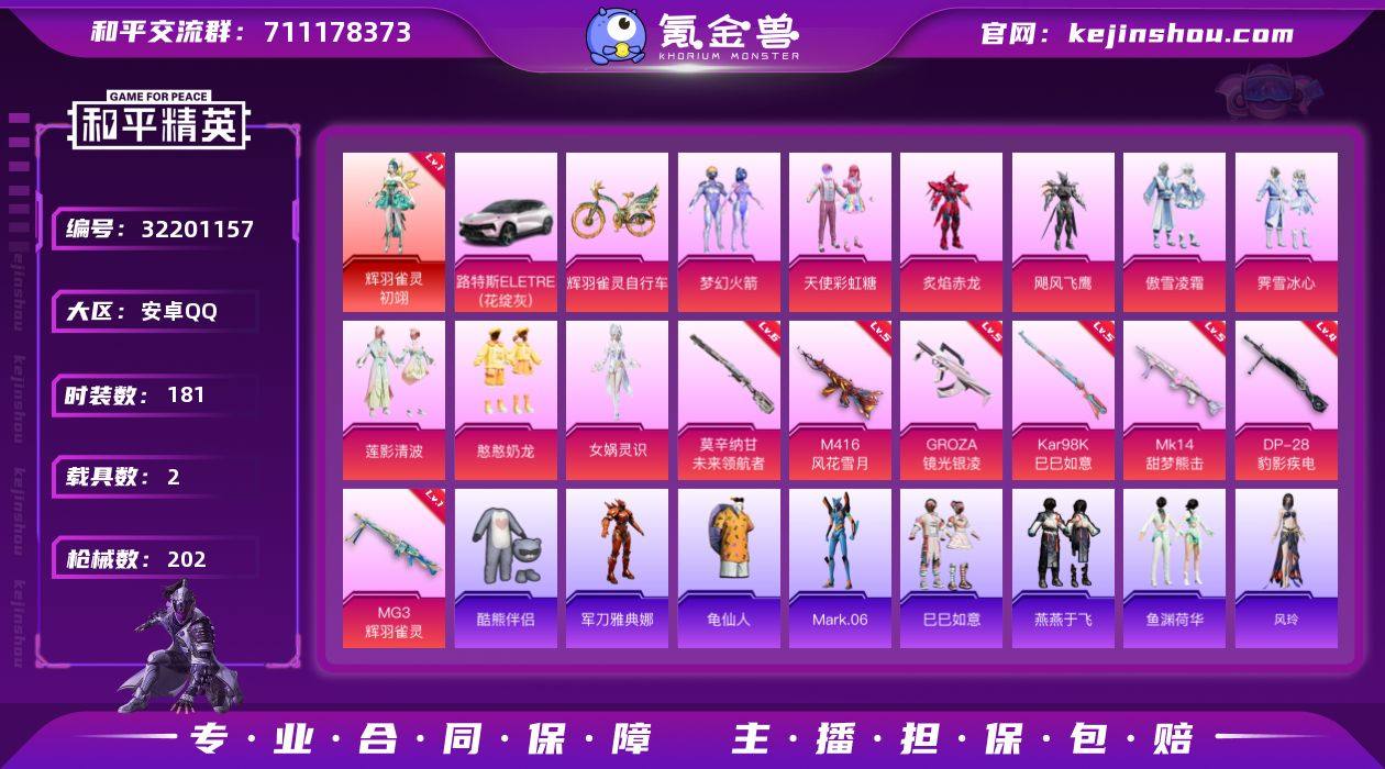 安卓 手Q-1神装-9粉装-7特效枪-2载具-2粉色飞行器-67837热力值-6王牌印记-181套装-202枪皮 【红色神装等级】:辉羽雀灵-初翊(一级) 【红色角色神装】:辉羽雀灵-初翊 【热门品类】:粉装-梦幻火箭,角色-军刀雅典娜,套装-龟仙人,角色-Mark.06 【粉色套装】:粉装-天使彩虹糖,粉装-梦幻火箭,粉装-炙焰赤龙,粉装-飓风飞鹰,粉装-傲雪凌霜,粉装-霁雪冰心,粉装-莲影清波,粉装-憨憨奶龙,角色-女娲灵识 【粉色枪皮等级】:M416-风花雪月(五级),GROZA-镜光银凌(五级),Kar98K-巳巳如意(五级),Mk14-甜梦熊击(五级),莫辛纳甘-未来领航者(六级),DP-28-豹影疾电(四级),MG3-辉羽雀灵(一级) 【粉色载具】:路特斯ELETRE(花绽灰),辉羽雀灵自行车 【粉色枪皮】:M416-风花雪月,GROZA-镜光银凌,Kar98K-巳巳如意,Mk14-甜梦熊击,莫辛纳甘-未来领航者,DP-28-豹影疾电,MG3-辉羽雀灵 【粉色飞行器】:雀灵庇佑飞行器 【粉色降落伞】:梦幻火箭降落伞,四圣焕新降落伞,古战神甲降落伞,齐天大圣降落伞,环太平洋降落伞,绒雪飘舞降落伞,垂柳戏鸭降落伞,太空嘟嘟降落伞,飒粉甜心降落伞,圣堂之誓降落伞,精灵梦叶罗丽降落伞,创世·救赎降落伞,辉羽雀灵降落伞,炫彩糖果降落伞 【稀有套装】:套装-龟仙人,套装-巳巳如意,套装-雪国风尚,套装-燕燕于飞,套装-鱼渊荷华,角色-风玲,套装-紫幽梦,套装-蓝冰羽,套装-霓虹热舞 【稀有枪皮】:AKM-冰凉西瓜,AKM-奇异狩猎者,AKM-破晓战魂,AKM-虎虎生威,AKM-龙的传人,M16A4-甜心亚梦,M16A4-生命誓言,M16A4-红色方程式,SCAR-L-玉兔迎春,SCAR-L-生命誓言,M416-圣诞惊喜,M416-糯团青竹,M416-红色方程式,M416-蓝色火焰,GROZA-懵萌河马,AUG-凝视深渊,AUG-天降萌叽,AUG-耀粉歌者,QBZ-原初圣火,QBZ-彩虹符号,QBZ-电玩视界,M762-天降萌叽,M762-牛气...