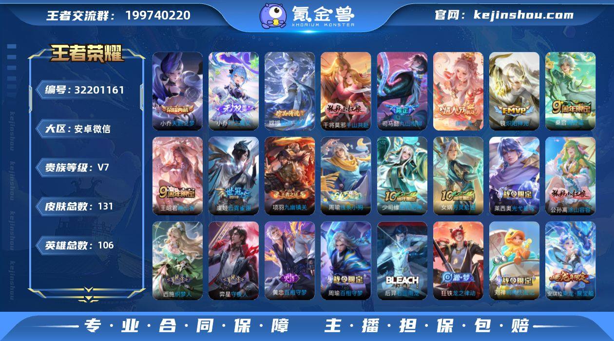 实名: 可修改 性别: 男号 贵族等级: V7 英雄数: 106 皮肤数: 131 荣耀水晶: 天鹅之梦 无双皮: 小乔时之魔女 珍品传说: 器灵·落星盏 传说皮: 炽阳神光,云霓雀翎,续相思,九山相柳,千山共赴 限定皮: 鸣野蒿,映山客 亮点: 【优质装备】:天鹅之梦(小乔典藏),小乔时之魔女(小乔无双),器灵·落星盏,炽阳神光,云霓雀翎,千山共赴,涂山容容
