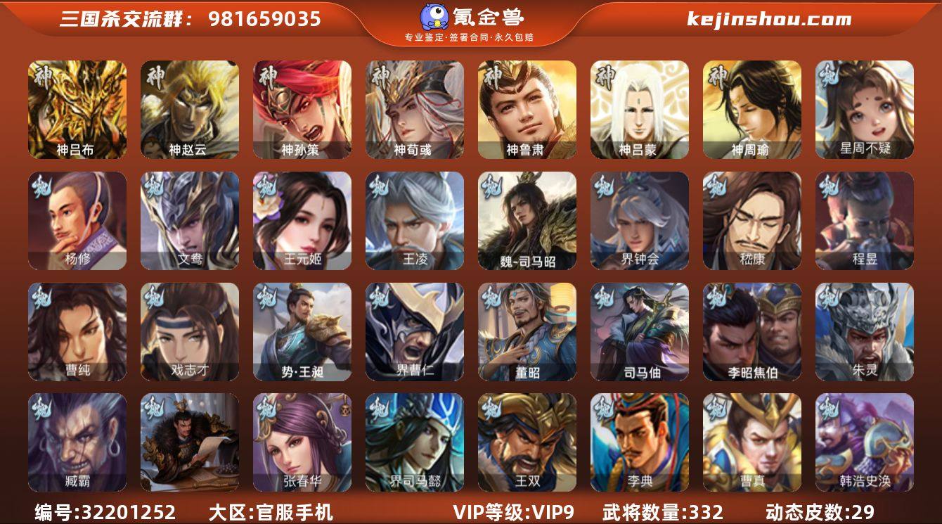 VIP等级: VIP9 官阶: 大将军 武将数量: 332 动态皮肤数量: 29 神将: 神吕布,神孙策,神荀彧,神赵云,神吕蒙,神周瑜,神鲁肃 魏国武将: 戏志才,曹纯,程昱,嵇康,界钟会,魏-司马昭,王凌,王元姬,文鸯,杨修,唐咨-魏,张辽,SP蔡文姬,SP关羽,SP贾诩,SP姜维,卞夫人,蔡贞姬,曹昂,曹操,曹冲,曹洪,曹丕,曹仁,曹叡,王异,张恭,鲁芝,界满宠,界曹植,满宠,荀攸,钟繇,郭嘉,牵招,荀彧,阮慧,杜畿,界郭嘉,崔琰,界荀彧,朱灵,界甄姬,界王异,界许褚,华歆,陈群,谋甄姬,司马孚,袁涣,李通,乐进,辛宪英,郭淮,毛玠,郭皇后,夏侯惇,曹植,司马朗,谋于禁,界曹操,星周不疑,许褚,界张辽,谋徐晃,张郃,钟会,文聘,曹彰,界夏侯惇,诸葛诞,司马懿,甄姬,界徐晃,徐晃,界曹仁,孙资刘放,韩浩史涣,曹真,典韦,夏侯渊,李典,于禁,王双,邓艾,界司马懿,张春华,孟达-魏,臧霸,朱灵(国战),李昭焦伯,司马伷,董昭,势·王昶 蜀国武将: 董允,谯周,沙摩柯,王平,诸葛瞻,谋赵云,马云騄,徐庶,杨仪,界关羽,界诸葛亮,邓芝,费祎,界黄月英,界张嶷,赵云,张松,彭羕,李丰,界刘备,谋姜维,刘封,糜竺,谋庞统,黄月英,关羽,王甫赵累,吴懿,祝融,张飞,黄皓,魏延,界周仓,谋祝融,马忠,界法正,糜夫人,刘禅,界赵云,张翼,SP孙尚香,SP徐庶,卧龙诸葛,周仓,简雍,谋孟获,界关兴张苞,诸葛亮,界张飞,法正,界简雍,赵统赵广,界马岱,关平,马岱,界庞统,庞统,诸葛果,谋张飞,马谡,马超,霍峻,廖化,关兴张苞,孟获,夏侯氏,姜维,黄忠,刘备,李严,马良,彭羕(国战),甘夫人,蜀-糜芳傅士仁,SP甘夫人,势陈到 吴国武将: 贺齐,界徐盛,界朱然,文鸯,潘濬,周泰,全琮,吕蒙,诸葛恪,界孙尚香,界顾雍,大乔小乔,桥公,谋周瑜,许贡,丁奉,谋吕蒙,周鲂,界全琮,孙茹,顾雍,孙亮,界朱治,孙休,严畯,界孙权,界凌统,祖茂,濮阳兴,界虞翻,界吕蒙,孙登,凌操,孙尚香,程普,大乔,韩当,陆逊,诸葛瑾,朱然,太史慈,虞翻,界孙坚,界黄盖,孙鲁班,界周瑜,界潘璋马忠...