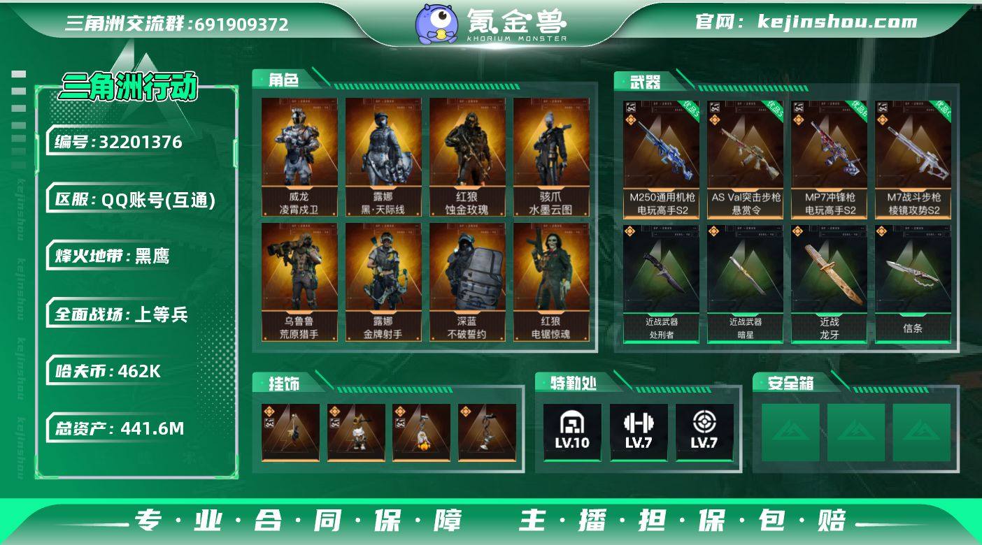 实名:不可二次实名 总资产:441.6M 哈夫币:462K 烽火地带段位:黑鹰 烽火地带等级:60 全面战场段位:上等兵 全面战场等级:41 10级仓库,7级训练中心,7级靶场,6级指挥中心,3级潜水中心,3级防具台,3级工作台,3级制药台,3级技术中心,2级收藏室 战术部门等级:4 战斗部门等级:4 医疗部门等级:4 研发部门等级:4 后勤部门等级:4 曼德尔砖-气象感应:0 曼德尔砖-命运王牌:0 曼德尔砖-电玩高手:0 曼德尔砖-美杜莎:0