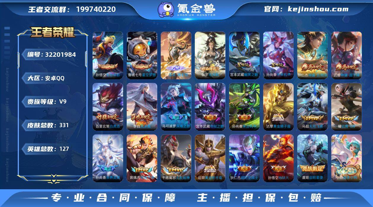 安卓Q-V9-最强王者段位-127英雄-331皮肤-2典藏皮肤-1无双-1珍品传说-17传说-97史诗,发育路42段打野33,对抗路31,中路20 【英雄全皮】:孙权全皮,猪八戒全皮,影全皮 【荣耀典藏】:孙悟空全息碎影,鲁班七号星空梦想 【无双皮肤】:曜器灵螭龙剑 【珍品传说】:伽罗沧流箭 【传说皮肤】:云缨神骥越千峰,狄仁杰神骥赴朔漠,裴擒虎祥瑞亨通,马可波罗深海之息,马超无双飞将,孙尚香异界灵契,虞姬启明星使,曜云鹰飞将,干将莫邪久胜战神,达摩黄金狮子座,百里玄策白虎志,后羿黄金射手座,李白凤求凰,孙尚香末日机甲,宫本武藏地狱之眼,孙悟空地狱火,狄仁杰超时空战士 【限定皮肤】:白起狰,狄仁杰阴阳师,赵云皇家上将,墨子神迹守卫,嬴政优雅恋人,嬴政白昼王子,孙尚香异界灵契,鲁班七号狮舞东方,庄周高山流水,高渐离死亡摇滚,阿轲迷踪丽影,孙膑妖精王,扁鹊炼金王,芈月重明,芈月白晶晶,吕布猎兽之王,吕布御风骁将,周瑜赤莲之焰,元歌云间偶戏,元歌无心,夏侯惇朔风刀,甄姬游园惊梦,曹操烛龙,典韦穷奇,典韦蓝屏警告,典韦岱宗,马可波罗逐梦之星,马可波罗暗影游猎,马可波罗深海之息,马可波罗山海玄木吟,狄仁杰魔术师,狄仁杰万华元夜,达摩星际陆战队,达摩沙漠行僧,项羽海滩派对,项羽霸王别姬,老夫子醍醐杖,老夫子航海奇遇记,程咬金演武夺筹,刘邦夺宝奇兵,韩信飞衡,兰陵王驯魔猎人,兰陵王金庭之子,花木兰默契交锋,亚瑟潮玩骑士王,孙悟空至尊宝,孙悟空大圣娶亲,牛魔御旌,后羿如梦令,后羿圣弓游侠,李元芳银河之约,李元芳云中旅人,虞姬霸王别姬,虞姬启明星使,钟馗神迹守卫,钟馗驱傩正仪,杨玉环遇见飞天,女娲朔望之晖,干将莫邪真爱魔法,雅典娜单词大作战,雅典娜黎明之约,蔡文姬繁星吟游,太乙真人饕餮,太乙真人华丽摇滚,东皇太一逐梦之光,鬼谷子原...