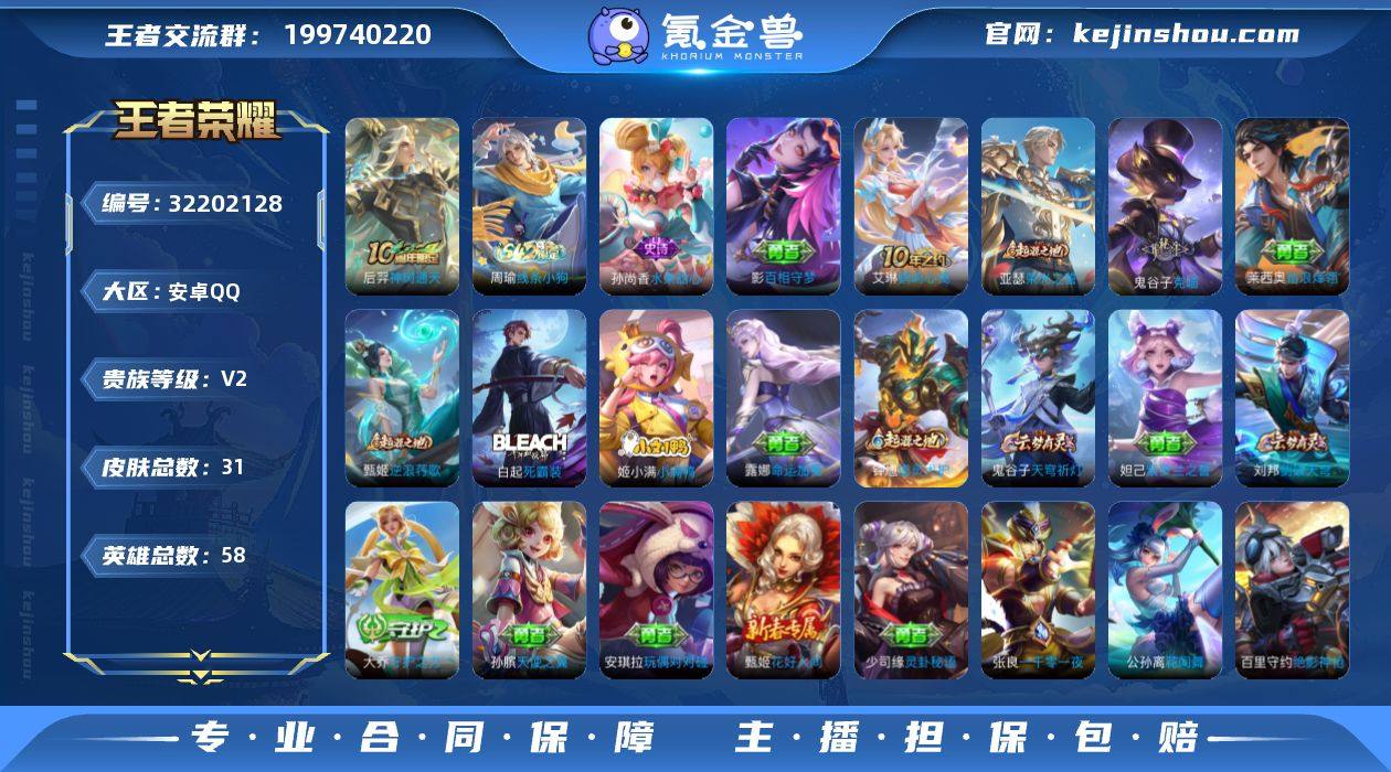 安卓Q-V2-尊贵铂金IV段位-58英雄-29皮肤-1传说-1史诗 【传说皮肤】:后羿神树通天 【限定皮肤】:鬼谷子天穹祈灯,刘邦剑破天穹 【赛季限定】:鬼谷子天穹祈灯,刘邦剑破天穹,钟馗虚灵犬护,甄姬逆浪荇歌,亚瑟荣光之誓 【战令限定】:周瑜线条小狗 【史诗皮肤】:周瑜线条小狗,孙尚香水果甜心 【其他皮肤】:艾琳鹤鸣心笺,亚瑟荣光之誓,鬼谷子克喵,莱西奥踏浪烽翎,甄姬逆浪荇歌,白起死霸装,姬小满小满鸭,露娜命运加冕,钟馗虚灵犬护,少司缘灵卦秘语,刘邦剑破天穹,鬼谷子天穹祈灯,妲己紫罗兰之誓,大乔守护之力,甄姬花好人间,安琪拉玩偶对对碰,瑶森,公孙离花间舞,女娲尼罗河女神,百里守约绝影神枪,蔡文姬蔷薇王座,小乔万圣前夜,张良一千零一夜,花木兰剑舞者,貂蝉异域舞娘,露娜绯红之刃 【营地ID】:1735105413