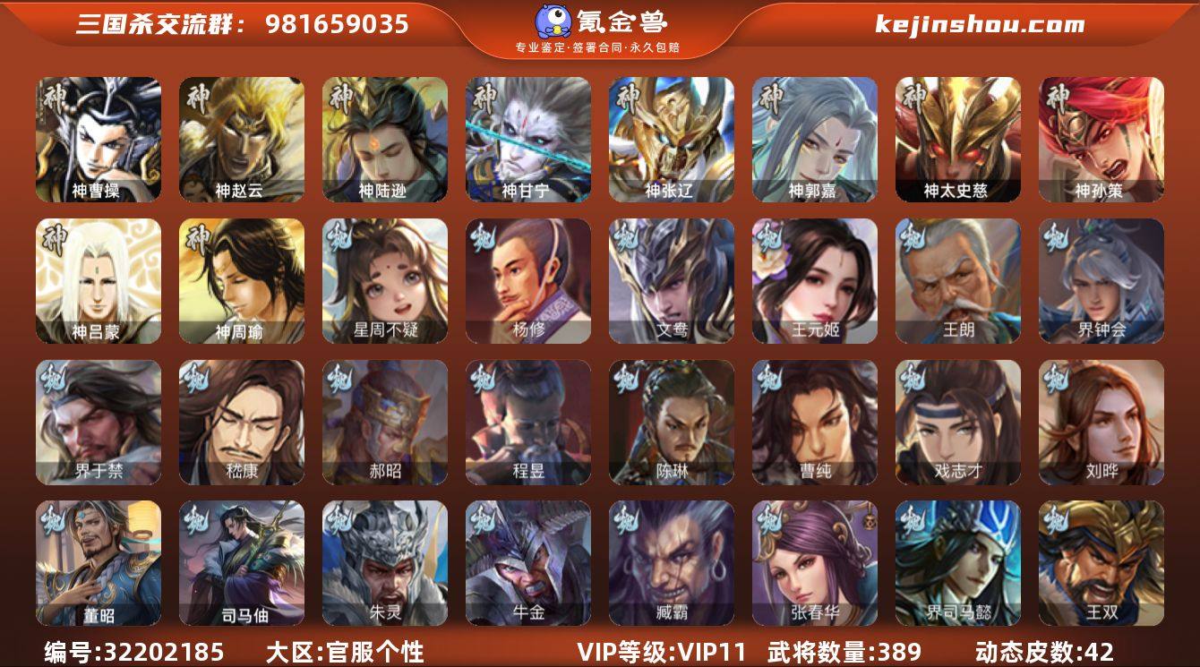 VIP等级: VIP11 官阶: 大将军 武将数量: 389 动态皮肤数量: 42 神将: 神曹操,神甘宁,神郭嘉,神陆逊,神孙策,神太史慈,神张辽,神赵云,神吕蒙,神周瑜 魏国武将: 刘晔,戏志才,曹纯,陈琳,程昱,郝昭,嵇康,界于禁,界钟会,王朗,王元姬,文鸯,杨修,唐咨-魏,张辽,SP蔡文姬,SP曹仁,SP关羽,SP贾诩,SP姜维,SP庞德,卞夫人,曹昂,曹操,曹冲,曹洪,曹丕,曹仁,曹叡,王异,张恭,鲁芝,界满宠,曹休,界曹植,满宠,荀攸,王基,钟繇,郭嘉,牵招,荀彧,阮慧,杜畿,界郭嘉,崔琰,界曹丕,界荀彧,朱灵,界甄姬,吕虔,界王异,界许褚,界郭淮,华歆,陈群,界邓艾,界典韦,界曹休,袁涣,李通,乐进,辛宪英,郭淮,界曹彰,郭皇后,毌丘俭,夏侯惇,曹植,司马朗,谋于禁,界曹操,星周不疑,许褚,界张辽,谋徐晃,张郃,钟会,文聘,曹彰,界夏侯惇,诸葛诞,司马懿,甄姬,杨阜,界徐晃,徐晃,孙资刘放,韩浩史涣,胡班,曹真,典韦,界夏侯渊,夏侯渊,李典,于禁,王双,邓艾,界司马懿,张春华,臧霸,牛金,朱灵(国战),司马伷,董昭 蜀国武将: 花鬘,谯周,沙摩柯,张星彩,诸葛瞻,谋马超,谋赵云,马云騄,徐庶,界魏延,杨仪,吕凯,界关羽,界诸葛亮,邓芝,界伊籍,胡金定,费祎,严颜,界黄月英,界张嶷,赵云,张松,彭羕,李丰,界刘备,界刘禅,谋姜维,刘封,糜竺,谋庞统,黄月英,刘巴,关羽,吴懿,向宠,祝融,张飞,黄皓,陈震,魏延,界周仓,马忠,界法正,糜夫人,界孟获,刘禅,界赵云,谋诸葛亮,界姜维,关银屏,界祝融,SP孙尚香,SP徐庶,卧龙诸葛,周仓,简雍,界关兴张苞,诸葛亮,孙乾,界张飞,界卧龙诸葛,法正,界简雍,赵统赵广,陈到,界马岱,关平,马岱,界庞统,庞统,诸葛果,马谡,马超,廖化,关兴张苞,孟获,夏侯氏,姜维,黄忠,刘备,界马超,李严,马良,傅肜,蒋琬费祎,许靖,刘谌,彭羕(国战),甘夫人,蜀-糜芳傅士仁 吴国武将: 贺齐,界步练师,界徐盛,界朱然,留赞,吴景,文鸯,潘濬,周泰,全琮,吕蒙,SP庞统,诸葛恪,界孙尚香,界顾雍,大乔小乔,桥公,界程普...