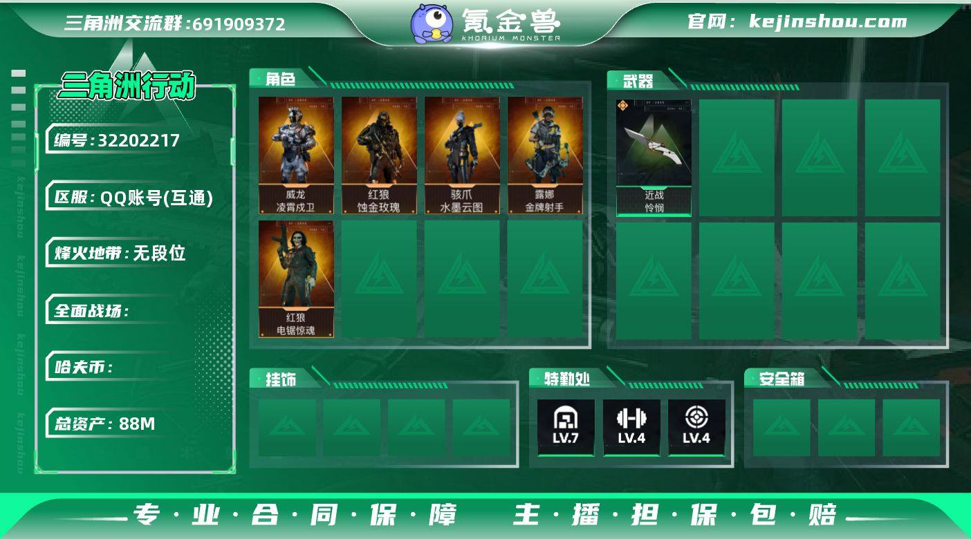 88m总资产【干员外观】:红狼蚀金玫瑰,电锯惊魂,威龙凌霄戍卫,露娜金牌射手,骇爪水墨云图【近战皮肤】:怜悯