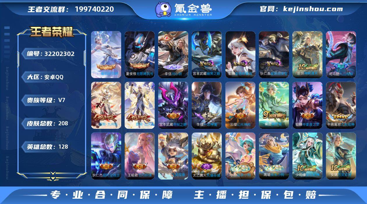 安卓Q-V7-永恒钻石IV段位-128英雄-208皮肤-2典藏皮肤-1无双-13传说-62史诗 【英雄全皮】:司马懿全皮,孙权全皮,苍全皮,空空儿全皮,影全皮 【荣耀典藏】:夏侯惇无限飓风号,伽罗最初的交响 【无双皮肤】:李信问心剑 【传说皮肤】:后羿神树通天,司马懿九山相柳,司空震愿照山河定,澜愿照九州拓,云缨幻光神枪,桑启鸣野蒿,王昭君乞巧织情,李元芳飞鸢探春,李信一念神魔,干将莫邪久胜战神,貂蝉仲夏夜之梦,宫本武藏地狱之眼,狄仁杰超时空战士 【限定皮肤】:蒙犽顽岩魄,虞姬夏日便利店,姜子牙天穹之誓,狄仁杰阴阳师,赵云皇家上将,孙尚香蔷薇恋人,庄周高山流水,阿轲迷踪丽影,元歌无心,狄仁杰魔术师,达摩沙漠行僧,项羽海滩派对,老夫子圣诞老人,兰陵王金庭之子,孙悟空至尊宝,李元芳云中旅人,钟馗驱傩正仪,苏烈千军破阵,沈梦溪大漠名商,猪八戒猪悟能,艾琳流音漫舞,妲己灵卜魔法,鬼谷子天穹祈灯,姬小满妄想食味,沈梦溪龙舞盛年,刘邦剑破天穹,程咬金群星魔术团,周瑜熔金海岸 【年限皮肤】:司空震愿照山河定,澜愿照九州拓 【赛季限定】:钟馗驱傩正仪,苏烈千军破阵,达摩沙漠行僧,兰陵王金庭之子,沈梦溪大漠名商,李元芳云中旅人,鬼谷子...