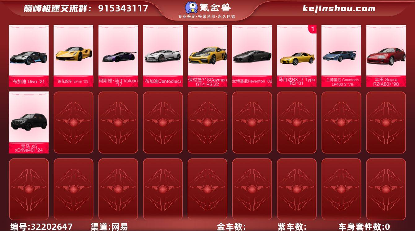 网易支付状态:未注册 换绑冷却:无冷却 0阶宝马 X5 xDrive40i '24 1阶马自达RX-7 Type RS '01,0阶兰博基尼 Countach LP400 S '78,0阶丰田 Supra RZ(A80) '98 0阶保时捷718 Cayman GT4 RS '22,0阶兰博基尼Reventon '08 0阶布加迪 Divo '21,0阶莲花跑车 Evija '23,0阶阿斯顿·马丁Vulcan '17,0阶布加迪Centodieci '20 卖家说:诚心卖号价格合适直接出