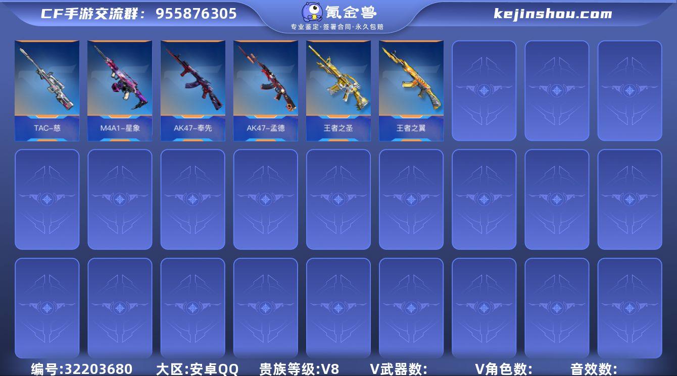 安卓QQ,角色等级:168,V武器数量:415,V角色数量:11,王者武器数:19,万化数量:73, 【人物角色】孙悟空,洛克,云悠悠,关小雨,香香,樱,堕天使,龙野,萝拉,春节兰,圣诞灵狐,魅惑灵狐,曼陀罗,夜玫瑰,潘多拉,斯沃特,零-新生,秦师,炽天使-X,云悠悠-心动起点,职场灵狐,职场灵狐-赛事经理, 【王者武器】王者之誉,王者之霆,王者之魄-冠军珍藏,王者之蝶,王者之心,王者之影,王者之翼,王者之戮,王者之怒,王者之光,王者之魂,王者之轮,王者之锋,王者之啸,王者之击,王者之烈,王者之神,王者之狱,王者之隐, 【带V枪械】M4A1-海骑士,M4A1-赛博雷神,M4A1-仲达,M4A1-龙血,M4A1-变色龙,M4A1-威侯,M4A1-樱龙·二觉,M4A1-星象,M4A1-竞技战魂,M4A1-武圣,M4A1-君威GS,M4A1-玫瑰精灵,M4A1-黑龙,M4A1-黑骑士,M4A1-雷神,47-云舞,AK47-血武士,AK47-雷麒麟,AK47-亚龙,AK47-奉先,AK47-竞技战魂,AK47-冰魂觉醒,AK47-耀金伯爵,AK47-游骑兵,AK47-沙漠领主,AK47-黑武士,AK47-火麒麟,AK47-无影,81式-光明之神,HK416-混世行者,AUG-机械纪元,SCAR-文远,QBZ95-天使,QBZ03-湮灭,QBZ03-金色蔷薇,98K-黑骑士,AK12-天启,M200-心动次元觉醒,M200-幻神,巴雷特-枪娘,巴雷特-雷神,巴雷特-极光,AWM-妙才,AWM-裁决,AWM-天龙,RPK-赤炎盘龙,RPK-盘龙,加特林-蟒蛇,加特林-堡垒,刘易斯-血月,MG3-雏凤,5-极光,5-机械纪元,双持斯泰尔-天使,汤姆逊-烈龙,KSG-黑骑士,双管猎枪-黑骑士,沙鹰-无影,沙鹰-天神,沙鹰-火麒麟,沙鹰-修罗,23-幻神,双持沙鹰-亚龙,左轮-黑武士,COP 357-雷霆,QSZ92-天使,QSZ92-金色蔷薇,CZ75-死神,GLOCK18-武圣, 【万化皮肤】王者之锋-冰霜奇迹,王者之击-HeartShot,王者之心闪光弹-Hea