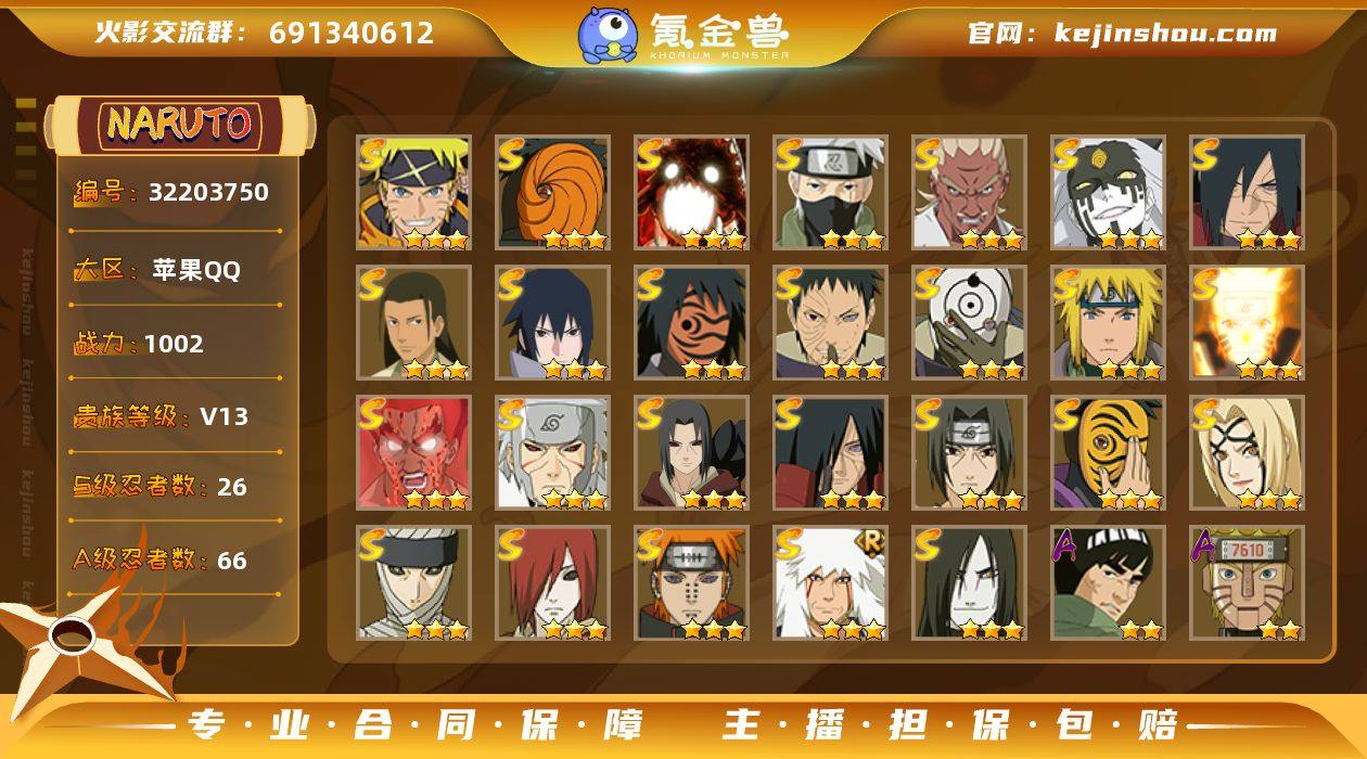 MCK630892 【1002W战力创柱五影斑六尾26S+忍战凯黑绝晓创生飞段66A】 战力1002 账号等级145 忍者总数238 游戏大区362 魅力值14750 S忍碎片数量3388 剩余金币(万)2.38 剩余高招券29 【可修改】 【榜五百内】 【VIP13】 S级忍者26 A级忍者66 通灵兽19 秘卷3 时装10 决斗场景1 主场景1 决斗幕布4 S级忍者:秽土转生宇智波斑,忍界大战宇智波带土,红夜之刃神秘面具男,木叶创立千手柱间,秽土转生解宇智波斑,神秘面具男,忍界大战艾,秽土转生千手扉间,五影会谈宇智波斑,舞之豪杰自来也,暴怒第六尾漩涡鸣人,须佐能乎旗木卡卡西,漩涡鸣人·宇智波佐助,死门迈特凯,波风水门,大蛇丸,须佐能乎宇智波鼬,天道佩恩,九喇嘛连结漩涡鸣人,永恒万花筒宇智波佐助,白面具宇智波斑,百豪纲手,秽土转生宇智波鼬,大筒木桃式,秽土转生长门,二代目土影无; A级忍者:新春限定宇智波鼬,宇智波泉奈,六代目水影长十郎,元气夏日旗木卡卡西,绝,忍者之路神秘面具男,死司凭血飞段,不风,五代目雷影达鲁伊,新春限定迪达拉,桃式显现漩涡博人,夏日限定宇智波鼬,不缘,新春限定我爱罗,漂泊浪客小南,幻之真容旗木卡卡西,不动,忍界大战奇拉比,黑绝,晓大蛇丸,漂泊浪客宇智波带土,地陆,羁绊神农,四代目土影黑土,青春爆炸迈特凯,百豪春野樱,忍界大战秋道丁次,忍界大战日向宁次,忍界大战李洛克,忍界大战我爱罗,忍界大战勘九郎,秽土转生迪达拉,秽土转生角都,漂泊武士桃地再不斩,近松十人卫千代,迈特凯,初始形态机械鸣人,疾风传咒印宇智波佐助,宇智波鼬,干柿鬼鲛,夏日泳装照美冥,桃地再不斩,疾风传我爱罗,晓创生飞段,迪达拉,青年长门,蝎,飞段,猿飞阿斯玛,猿飞木叶丸,阿飞,奇拉比,仙人模式漩涡鸣人,万花筒写轮眼宇智波佐助,绯流琥蝎,青年波风水门,青年艾,三忍之师猿飞日斩,漂泊...