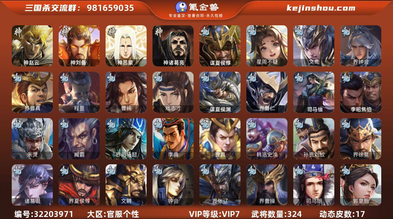 VIP等级: VIP7 官阶: 骠骑将军 武将数量: 324 动态皮肤数量: 17 神将: 神刘备,神赵云,神吕蒙,神诸葛亮 魏国武将: 戏志才,曹纯,程昱,界曹真,界钟会,文鸯,唐咨-魏,张辽,SP蔡文姬,SP曹仁,SP关羽,SP贾诩,SP姜维,卞夫人,蔡贞姬,曹昂,曹操,曹冲,曹洪,曹丕,曹仁,曹叡,王异,张恭,界满宠,曹休,界曹植,满宠,荀攸,钟繇,郭嘉,牵招,荀彧,杜畿,界郭嘉,崔琰,界曹丕,界荀彧,朱灵,吕虔,界王异,界许褚,华歆,陈群,界邓艾,袁涣,乐进,辛宪英,郭淮,毛玠,郭皇后,夏侯惇,曹植,司马朗,谋于禁,界曹操,星周不疑,许褚,界张辽,谋徐晃,钟会,文聘,曹彰,界夏侯惇,诸葛诞,司马懿,甄姬,界徐晃,徐晃,界曹仁,孙资刘放,韩浩史涣,曹真,典韦,夏侯渊,李典,于禁,邓艾,界司马懿,臧霸,朱灵(国战),谋夏侯惇,李昭焦伯,司马伷,谋夏侯渊 蜀国武将: 董允,关索,花鬘,谯周,沙摩柯,谋赵云,徐庶,界魏延,界关羽,界诸葛亮,邓芝,胡金定,费祎,赵云,张松,彭羕,李丰,界刘备,谋法正,刘封,糜竺,李遗,蒋琬,谋庞统,黄月英,关羽,王甫赵累,吴懿,吴班,界廖化,祝融,张飞,黄皓,陈震,魏延,马忠,界法正,糜夫人,界孟获,刘禅,界赵云,谋诸葛亮,界姜维,张翼,关银屏,界祝融,SP孙尚香,SP徐庶,卧龙诸葛,周仓,简雍,界关兴张苞,诸葛亮,法正,界简雍,赵统赵广,界马岱,关平,马岱,界庞统,庞统,诸葛果,谋张飞,马谡,马超,霍峻,廖化,关兴张苞,孟获,夏侯氏,姜维,黄忠,刘备,界马超,李严,马良,蒋琬费祎,刘谌,彭羕(国战),甘夫人,SP甘夫人,势陈到 吴国武将: 界徐盛,界朱然,周处,文鸯,界朱桓,潘濬,陆绩,张温,周泰,全琮,吕蒙,诸葛恪,界顾雍,大乔小乔,谋甘宁,谋周瑜,丁奉,谋吕蒙,周鲂,界全琮,蒋钦,顾雍,阚泽,孙亮,界朱治,严畯,界孙权,祖茂,濮阳兴,界虞翻,界吕蒙,凌操,朱治,孙尚香,程普,大乔,韩当,陆逊,诸葛瑾,朱然,吕范,太史慈,谋大乔,虞翻,界黄盖,孙鲁班,界周瑜,卫温诸葛直,孙权,界孙鲁班,谋小乔,鲁肃,界甘宁,吴...