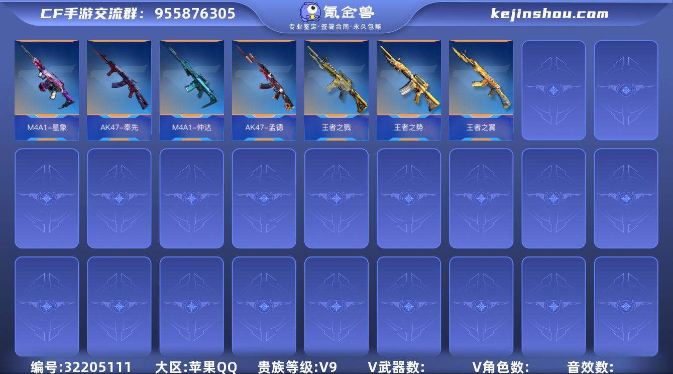 10英雄角色数-378英雄武器数 【王者系列】:王者之影,王者之魄,王者之心,王者之神,王者之锋,王者之迹,王者之蝶,王者之兽,王者之狱,王者之魂,王者幻神,王者之烈*2,王者之霆,王者之业,王者之誉,M4A1-雷霆王者,巴雷特-雷霆王者,M12S-雷霆王者,王者之尊 【热门武器】:KSG-孟获,CZS2-仲康,COP 357-安琪拉*2,AN94-盖,81式-光明之神,MK47-仁德,M4A1-七色宝葫,AK47-孟德,M4A1-仲达,AK47-奉先,M4A1-星象,M4A1-游骑兵,TAC-慈,VEPR12-本初,黑龙魂,81式-阿波罗,COP 357-雷霆*2 【角色】:葵,幽灵刀锋-觉醒,关小雨*2,晴雅,月神-X,甄梦,步练师*2 【英雄武器】:AK47-无影,AK47-火麒麟,AK47-机械迷城,AK47-孟德,AK47-猩红传说,AK47-燎天净火,AK47-奉先,AK47-黑鲨,AK47-木兰,AK47-谜城烟火*2,M4A1-雷神*2,M4A1-黑骑士*2,M4A1-死神,M4A1-游骑兵,M4A1-星象,M4A1-仲达,M4A1-竞界荣光,M4A1-七色宝葫,M4A1-机械迷城,M4A1-赛博雷神,M4A1-海骑士,M4A1-运输船*3,M4A1-猎神,M4A1-雷暴,M4A1-雷霆王者,M4A1-太白诗仙,M4A1-铁胆虎魄,SCAR-幽暗骑士*2,SCAR-幽暗骑士觉醒,SCAR Light-白虎,SCAR-探星者,SCAR-心动PICK,AN94-卷帘大将军,AN94-四凶觉醒,AN94-精卫填海,AN94-盖,AUG-机械纪元,FAMAS-湮灭,9A91-游骑兵,9A91-魔蜥觉醒,M14EBR-暗夜觉醒,M14EBR-天神,M14EBR-拂影,M14EBR-玄武,M14EBR-葫芦山庄,M16-恶魔,AK12-天启,QBZ03-金色蔷薇*2,QBZ03-死神,QBZ03-玉面羞花,HK416-极光,HK417-炎龙铠甲,81式-光明之神,QBZ19-天使*2,G36-李星云,MK47-云舞,MK47-仁德,G3A3-衍神兵*2,FN F2000-十绝阵觉醒,QBZ97-岚舞,QBZ97-浩瀚征途,QBZ191-金甲虎啸觉醒,QBZ191-封神榜,AWM-天龙,AWM-裁决,AWM-大湾溢彩,巴雷特-毁灭*6,巴雷特-极光*6,巴雷特-