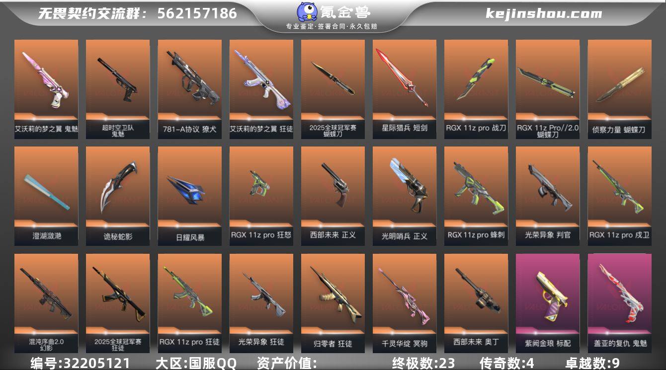 【qyz9369】6w库存+25冠军套+显卡套装 超多精品主站 未定级 精品账号 qyz9369 【近战武器】:近战武器-2025全球冠军赛 蝴蝶刀,近战武器-RGX 11z Pro 战刀,近战武器-RGX 11z Pro//2.0 蝴蝶刀,近战武器-侦察力量 蝴蝶刀,近战武器-黑波之刃,近战武器-澄湖潋滟,近战武器-影刃,近战武器-诡秘蛇影 军刀,近战武器-日耀风暴 遗器,近战武器-星际猎兵 短剑 【狂徒】:狂徒-艾沃莉的梦之翼,狂徒-2025全球冠军赛,狂徒-归零者,狂徒-RGX 11z Pro,狂徒-光荣异象,狂徒-盖亚的复仇,狂徒-诡秘蛇影,狂徒-神罚//2.0 【幻影】:幻影-混沌序曲//2.0,幻影-天界神兵//2.0,幻影-侦察力量,幻影-末日之翼 【戍卫】:戍卫-RGX 11z Pro,戍卫-紫阙金琅,戍卫-折光棱晶 【獠犬】:獠犬-781-A协议 【冥驹】:冥驹-千灵华绽,冥驹-盖世英雄 【飞将】:飞将-末日之翼 【莽侠】:莽侠-诡秘蛇影 【战神】:战神-盖世英雄 【奥丁】:奥丁-西部未来,奥丁-末日之翼 【判官】:判官-光荣异象,判官-诡秘蛇影 【骇灵】:骇灵-神中神罚,骇灵-无限竞技 【蜂刺】:蜂刺-RGX 11z Pro,蜂刺-折光棱晶 【标配】:标配-紫阙金琅,标配-折光棱晶 【正义】:正义-光明哨兵,正义-西部未来 【鬼魅】:鬼魅-艾沃莉的梦之翼,鬼魅-超时空卫队,鬼魅-盖亚的复仇,鬼魅-诡秘蛇影 【狂怒】:狂怒-RGX 11z Pro 【短炮】:短炮-末日之翼 【卡面】:树懒大作战 卡面,Clutch 卡面,无畏契约GO!第一卷:芮娜 卡面,无畏契约GO!第一卷:零 卡面,无垠星环 卡面,《双城之战》金克丝 卡面,代号红色 卡面,新兵报到 卡面,V契约 卡面,无畏契约 卡面 【喷漆】:审判之爪 喷漆,买装还是存钱 喷漆,放下武器 喷漆,胜利属于无畏契约 喷漆,GLHF 喷漆,无畏契约 喷漆 【挂饰】:无畏契约GO!第一卷 零 挂饰,动力机箱 挂饰,天外飞客 挂饰,《双城之战》魄...