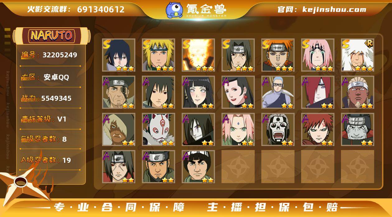 8S忍/19A忍/战力554W/V1/区服3274 【S忍者】 宇智波佐助「漩涡鸣人」,宇智波佐助「永恒万花筒」,春野樱「忍界大战」,漩涡鸣人「九喇嘛连结」,自来也「舞之豪杰」,宇智波鼬「须佐能乎」,佩恩「天道」,波风水门, 【A忍者】 迈特凯「青春爆炸」,土台「忍界大战」,长十郎「六代目水影」,不缘,日向雏田「最终章」,宇智波泉奈,长门「青年」,艾「青年」,达鲁伊「五代目雷影」,神秘面具男「忍者之路」,大蛇丸「晓」,春野樱「百豪」,飞段「死司凭血」,我爱罗「疾风传」,干柿鬼鲛,宇智波鼬,猿飞阿斯玛,迈特凯, PX_2496011