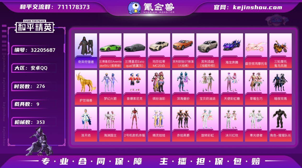 【kyhp402】安卓 手Q-23粉装-14特效枪-9载具-12粉色飞行器-138822热力值-11王牌印记-276套装-353枪皮 【热门品类】:粉装-梦幻火箭,粉装-音爆索尼克,粉装-缤纷油彩,套装-奇异狩猎者,角色-军刀雅典娜,角色-2B战斗服款,角色-2P战斗服款,套装-龟仙人,套装-潮萌小黄鸭,套装-粉红小猪 【粉色套装】:粉装-深海曼妙,粉装-宝贝奶油派,粉装-天使彩虹糖,粉装-梦幻火箭,粉装-缤纷油彩,粉装-草莓生巧,粉装-暗夜玫瑰,角色-洛天依,粉装-海渊国主,角色-2号机款机体服,粉装-精灵娃娃,粉装-赤焰黑爵,粉装-旋转彩虹,粉装-冰川红玫,粉装-寒光使者,粉装-音爆索尼克,角色-猩猩队长,粉装-萌物绒绒,粉装-炫光之旅,角色-蔷薇星,玩偶服-猪猪侠,角色-樱桃泡泡,角色-霁蓝缠春 【粉色枪皮等级】:AKM-星际浪客(四级),SCAR-L-天蓬元帅(七级),M416-五爪金龙(六级),GROZA-焦糖拿铁(五级),M762-甜心娃娃(四级),汤姆逊-冰川粉黛(五级),AKS-74U-森灵之息(四级),Kar98K-巳巳如意(五级),AMR-智耀战神(五级),DP-28-千金淑猫(四级),DP-28-豹影疾电(五级),MG3-洛神天依(七级),MG-36-沧焰双生(五级) 【粉色载具】:兰博基尼Aventador SVJ(翡翠绿),兰博基尼Estoque(银翼灰),玛莎拉蒂MC20(星石白),宾利欧陆GT敞篷(火焰橘),宾利添越(浅瞪羚棕),海龙奔腾,盛世惊鸿摩托车,鬼马风驰,护世瑞兽 【粉色枪皮】:AKM-星际浪客,SCAR-L-天蓬元帅,M416-五爪金龙,GROZA-焦糖拿铁,M762-甜心娃娃,汤姆逊-冰川粉黛,AKS-74U-森灵之息,Kar98K-巳巳如意,Mk14-福马献瑞,AMR-智耀战神,DP-28-千金淑猫,DP-28-豹影疾电,MG3-洛神天依,MG-36-沧焰双生 【粉色飞行器】:酣梦熊熊飞行器,春暖花开飞行器,梦幻火箭飞行器,齐天大圣飞行器,苔丝玫瑰飞行器,拂晓神骑飞行器,萌物绒绒飞行器,祥瑞锦鲤飞行器...