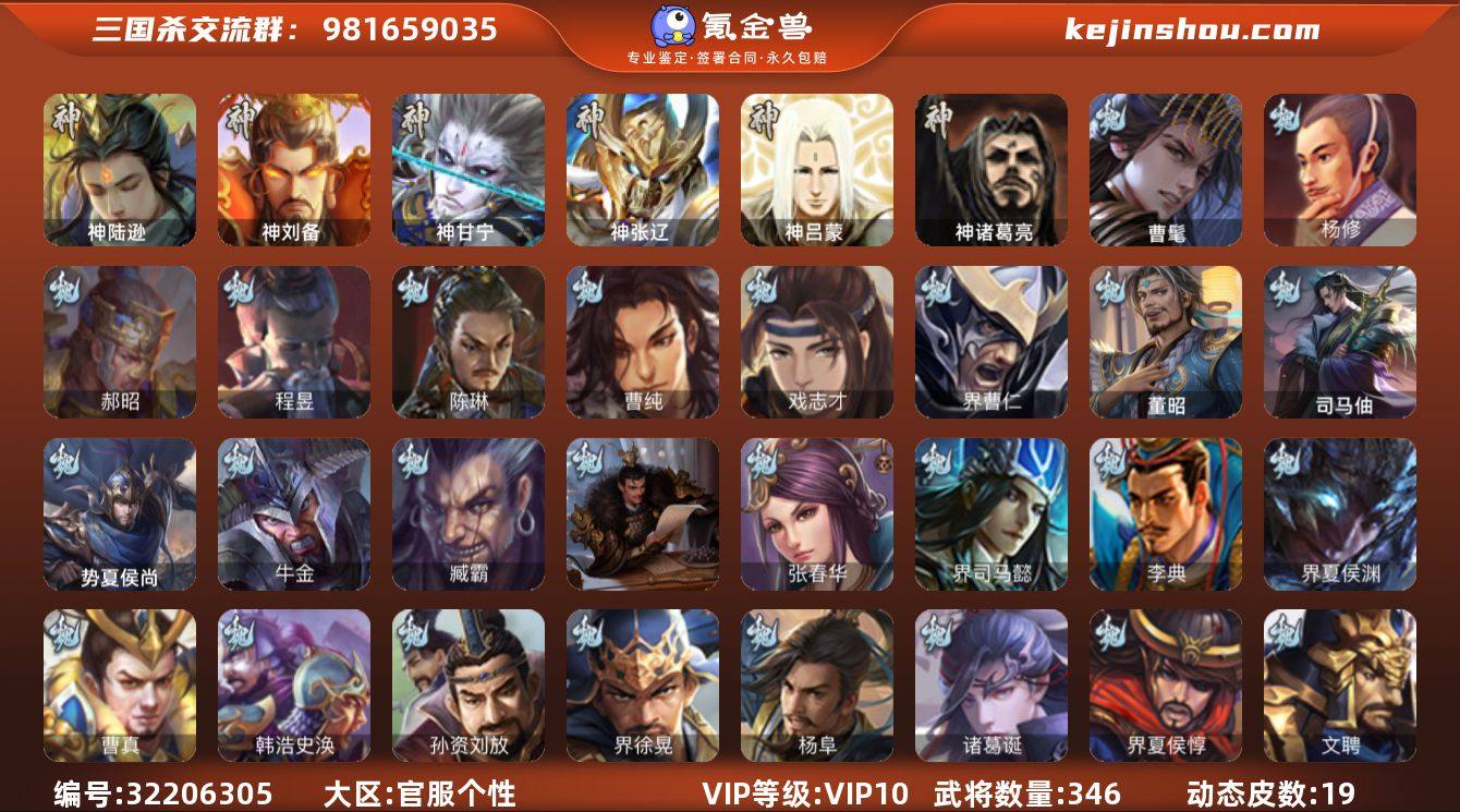 官阶:大将军;VIP等级:VIP10;史诗武将数量:42;动态皮肤数量:37;武将总数:368;史诗宝珠数量:13;将魂数量:1833;神将:7;魏国史诗武将:26;蜀国史诗武将:11;吴国史诗武将:4;群史诗武将:13 神赵云,神张辽,神郭嘉,神太史慈,神吕蒙,神周瑜,神诸葛亮,SP司马昭,王粲,杨修,界钟会,界曹真,嵇康,郝昭,曹纯,戏志才,马云騄,谋夏侯氏,谋马超,诸葛瞻,周群,赵襄,张星彩,王平,沙摩柯,谯周,花鬘,界朱然,界徐盛,界步练师,贺齐,左慈,郑玄,王允,苏飞,麹义,庞德公,刘璋,沮授,界李儒,公孙康,卑弥呼,张绣,许攸,神郭嘉-虎年清明(动态),神荀彧-虎年清明(动态),神周瑜-焰腾麒麟(动态),神曹操-天下归心,神曹操-玄天通冥(动态),神赵云-战龙在野(动态),SP司马昭-鼠年冬至(动态),甄姬-牛年清明(动态),荀彧-驱虎吞狼(动态),曹丕-牛年清明(动态),邓艾-神兵天降(动态),界甄姬-牛年清明(动态),界曹丕-牛年清明(动态),界邓艾-神兵天降(动态),张春华-牛年立冬(动态),钟会-谋谟之勋(动态),曹真-虎年春节(动态),界钟会-谋谟之勋(动态),戏志才-举棋若定(动态),羊徽瑜-牛年中秋(动态),刘备-猪年圣诞(动态),关羽-明良千古(动态),马超-牛年春节(动态),黄月英-明良千古(动态),界刘备-猪年圣诞(动态),界马超-牛年春节(动态),界黄月英-明良千古(动态),夏侯氏-明良千古(动态),SP孙尚香-猪年圣诞(动态),SP孙尚香-明良千古(动态),马云騄-猪年大雪(动态),赵襄-猪年春节(动态),鲍三娘-虎年七夕(动态),鲍三娘-柳娇桃艳(动态),胡金定-明良千古(动态),孙策-兔年清明(动态),黄盖-鏖战赤壁(动态),孙尚香-星流霆击(动态),大乔-猪年七夕(动态),界黄盖-鏖战赤壁(动态),界大乔-猪年七夕(动态),界孙尚香-星流霆击(动态),徐盛-破军杀将(动态),步练师-牛年七夕(动态),孙鲁班-牛年端午(动态),界步练师-牛年七夕(动态),界孙鲁班-牛年端午(动态),孙鲁育-猪年春节(动态),孙茹...