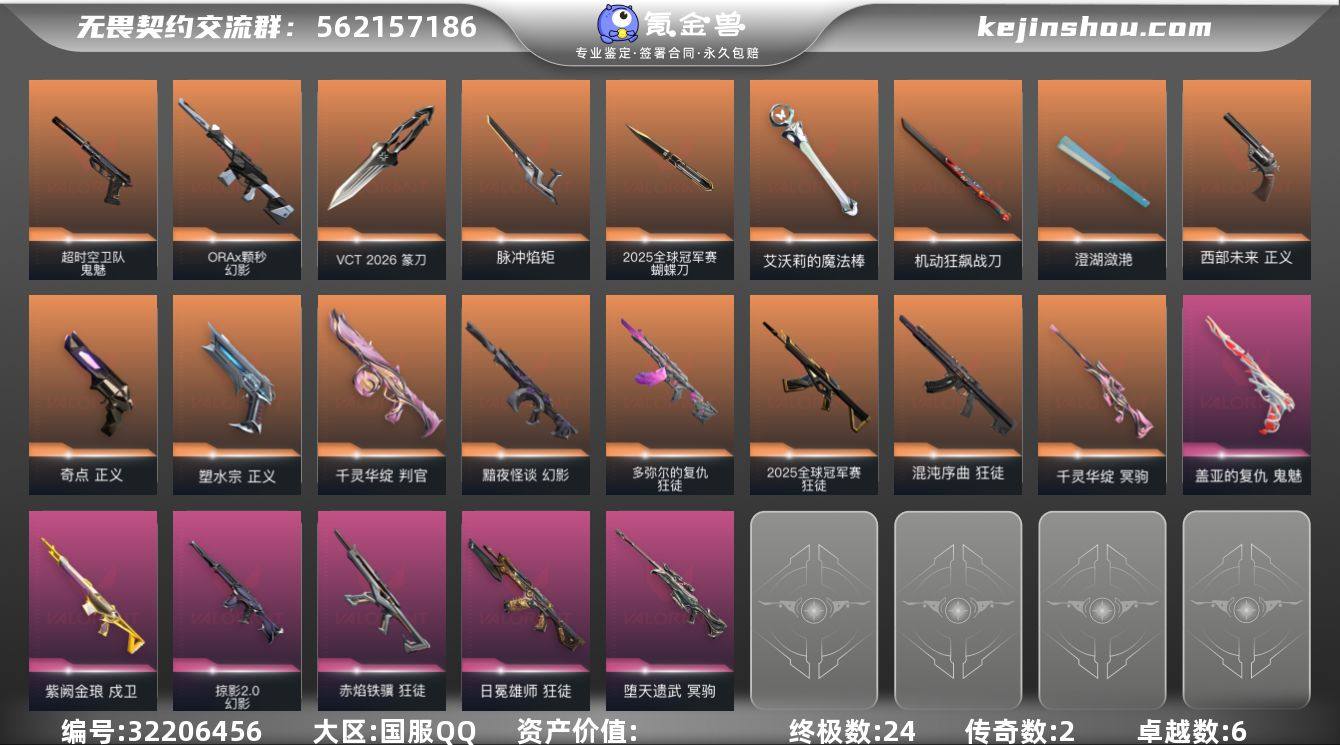 【6.7w库存25冠军套.VCT26纂刀.仙女棒.摩托直刀.天御刀.黑波之刃.镭切.脉冲焰矩】YXy5851【可二次】【因赛季更新游戏段付以上号为准!】 【套装】:2025全球冠军赛套装,VCT 2026 赛季套装 【英雄】:幻棱,炼狱,维斯,暮蝶,壹决,捷风,雷兹,不死鸟,贤者,猎枭,芮娜,尚勃勒,霓虹,斯凯,夜露,海神 【近战武器】:近战武器-2025全球冠军赛 蝴蝶刀,近战武器-碎心裂刃,近战武器-VCT 2026 篆刀,近战武器-脉冲焰矩,近战武器-紫金爪刀,近战武器-黑波之刃,近战武器-镭切,近战武器-艾沃莉的魔法棒,近战武器-澄湖潋滟,近战武器-机动狂飙 战刀,近战武器-圣石匕首,近战武器-天御刀,近战武器-夜刃诡镰 【狂徒】:狂徒-2025全球冠军赛,狂徒-混沌序曲,狂徒-多弥尔的复仇,狂徒-日冕雄师,狂徒-赤焰铁骥 【幻影】:幻影-黯夜怪谈,幻影-ORA x 颗秒,幻影-掠影//2.0 【戍卫】:戍卫-紫阙金琅 【冥驹】:冥驹-千灵华绽,冥驹-堕天遗武 【判官】:判官-千灵华绽 【骇灵】:骇灵-彩虹魔力小白马 【正义】:正义-奇点,正义-塑水宗,正义-西部未来 【鬼魅】:鬼魅-超时空卫队,鬼魅-盖亚的复仇 【卡面】:孵化小能手:破壳鸭 卡面,无畏契约GO!第一卷:芮娜 卡面,无畏契约GO!第一卷:零 卡面,代号红色 卡面,新兵报到 卡面,V契约 卡面,无畏契约 卡面 【喷漆】:孵化小能手:破壳鸭 喷漆,买装还是存钱 喷漆,胜利属于无畏契约 喷漆,GLHF 喷漆,无畏契约 喷漆 【挂饰】:孵化小能手:破壳鸭 挂饰,天外飞客 挂饰,无畏契约 纪念币 挂饰