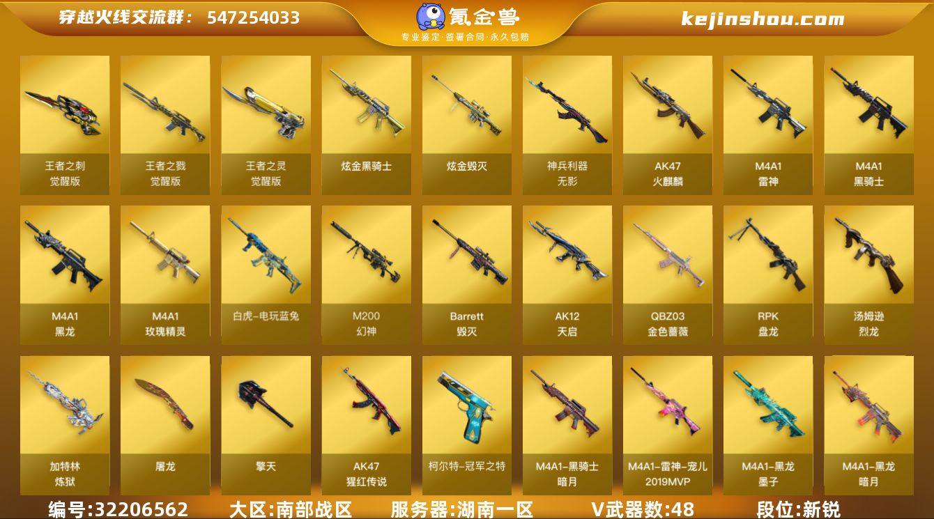 湖南一区-49V-4王者-2炫金 【热门武器】:QBZ03-金色蔷薇,M200-幻神,死亡之眼,白虎-电玩蓝兔,柯尔特-冠军之特,M4A1-黑骑士,汤姆逊-烈龙*6,RPK-盘龙,加特林-炼狱,斯泰尔-蝴蝶 【王者炫金武器】:炫金骑士,炫金毁灭 【音效卡】:M200-幻神音效卡,AK47-火麒麟音效卡,M4A1-雷神音效卡,M4A1-黑骑士音效卡,Barrett-毁灭音效卡,绝迹语音包 【皮肤】:幻神-纸灯龙皮肤,雷神-宠儿-2019MVP,火麒麟-平天大圣,火麒麟-巅峰荣耀,火麒麟-心动糖果,毁灭-星空,毁灭-冠军之怒,毁灭-风暴,黑龙-暗月,黑龙-墨子皮肤,黑骑士-暗月,战神-紫绶金章皮肤 【角色】:审判者,北极狐-X,初恋灵狐,风暴女,虎妞,嘉年华灵狐,荆棘玫瑰,娟娟,灵狐者-X,灵狐者-黄金海岸,灵狐者-职业经理,麻雀,曼陀罗-X,潘多拉-X,潜龙队-X,斯沃特-X,甜心偶像,雪莉杨,樱-战斗天使,影武者-X,职业选手 【人偶武器】:火麒麟-灵狐*2,斯泰尔-蝴蝶,AWM-灵狐-15周年嘉年华,迷你深渊冰龙,迷你波特博士,夺魂,迷你火种*3,迷你生化手雷,迷你超能女侍 【暴走生化】:死亡之眼,超级对讲机 【挑战大师】:神圣爆裂者III,冰龙粉碎者-白马银枪,激光毁灭者III-白马银枪,机甲撕裂者III,神圣爆裂者-末日III 【英雄级武器】:AK47-火麒麟*2,M4A1-黑龙,M4A1-雷神,M4A1-黑骑士,AK12-天启,无影-神兵利器,M4A1-玫瑰精灵,QBZ03-金色蔷薇,王者之戮-觉醒版,AK-47-猩红传说*2,白虎-电玩蓝兔,Barrett-毁灭,M200-幻神,Barrett-金色蔷薇,RPK-盘龙,加特林-炼狱,汤姆逊-烈龙*6,柯尔特-冠军之特,王者之灵-觉醒版,屠龙*2,擎天,王者之刺-觉醒版,高爆手雷-幻灵*3,高爆手雷-神工天巧*3,闪光弹-幻灵*3,闪光弹-神工天巧*3,烟雾弹-幻灵*2,烟雾弹-神工天巧*4,烟雾弹-雷霆王者-觉醒版 【道具】:亚洲杯纪念炫彩背包,全能枪...