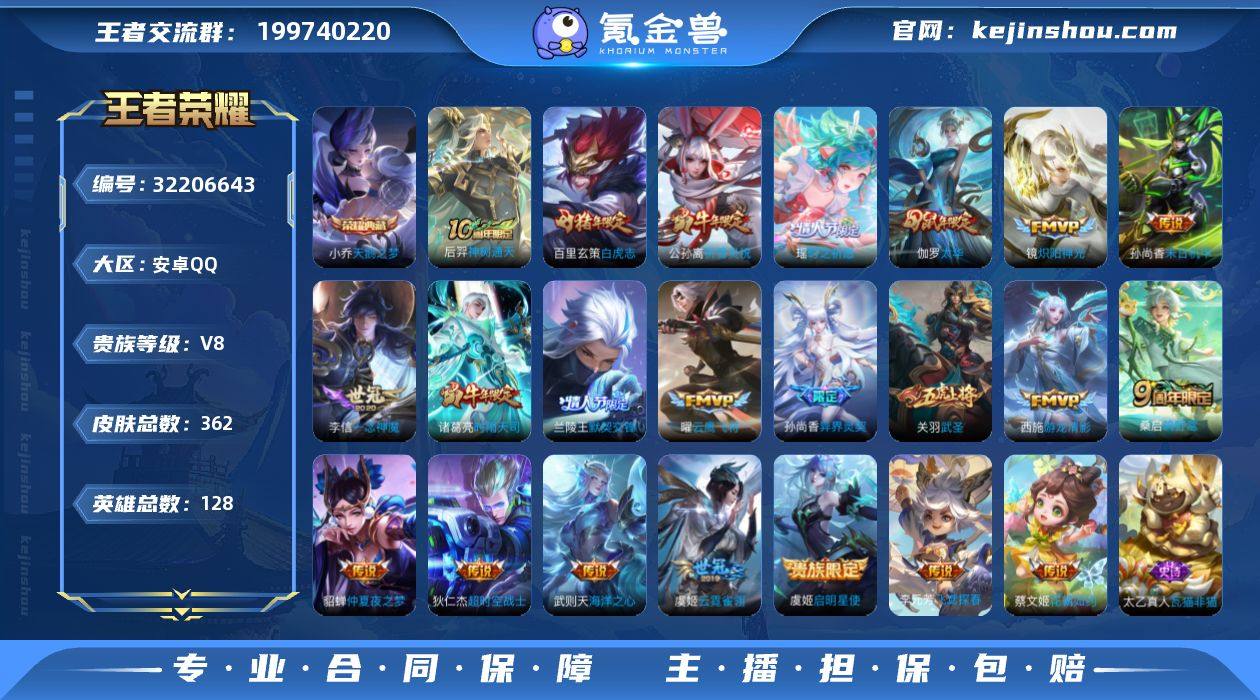 贵族等级:V8 典藏皮肤数:1 珍品无双皮肤数:0 无双皮肤数:0 珍品传说皮肤数:0 传说皮肤数:22 史诗皮肤数:116 皮肤数:362 英雄数:128 段位:荣耀王者 卖家说:号上还有一个未兑换荣耀水晶200皮肤碎片2000+战令币,