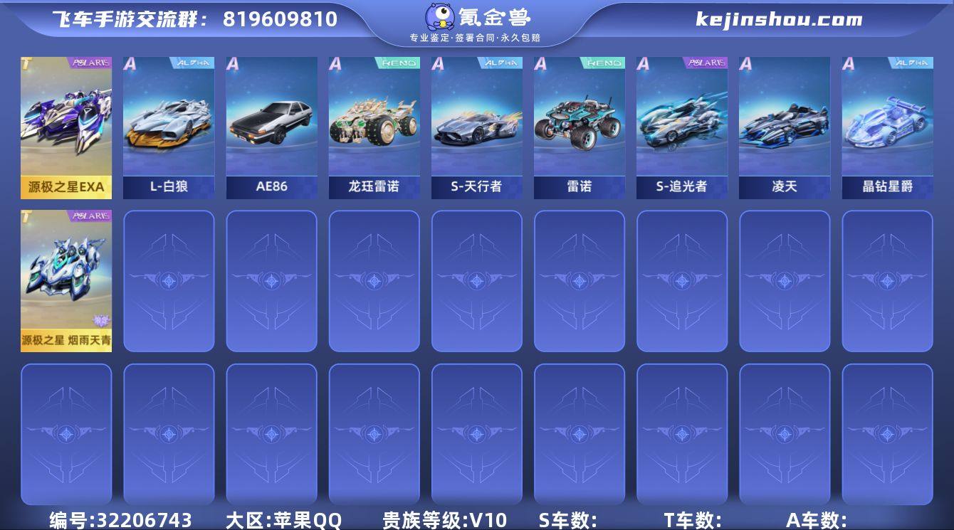 B653333 【V10/1幻生3魔法/2T经典机甲源极之星烟雨天青/3强联赛-溯光+s天行+s追光/强宠-机甲金刚+源梦之星+玉玺神虎/灼冰之舞女幻生+星之迹女装+幻蝶男装+水龙吟男装/3双人座椅-天籁之音+神域炎晶+紫魅冰晶/多个性化】 A车数量75 游戏等级88 T车数量2 【否】 【可二次实名】 【永久包赔】 【苹果QQ】 稀有车型1 稀有永久A车1 T车皮肤1 魔法时装1 永久T车1 宠物3 稀有车型:源极之星; 稀有永久A车:龙珏雷诺; T车皮肤:源极之星烟雨天青; 魔法时装:天蓬元帅; 永久T车:源极之星EXA; 宠物:机甲金刚,源梦之星,玉玺神虎;
