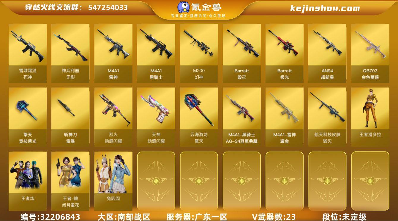 广东一区-30V-1王者武器数-0炫金武器数 【热门武器】:QBZ03-金色蔷薇,M200-幻神,M4A1-黑骑士 【音效卡】:烈火-动感闪耀 音效卡,M4A1-黑骑士音效卡,Barrett-毁灭音效卡,Barrett-极光音效卡,死神-雪域霜狐-怀旧音效卡 【皮肤】:幻神-冠军之幻,幻神-宠儿-2021MVP,QBZ03-巅峰荣耀皮肤,雷神-耀金皮肤,雷神-宇航兔皮肤,雷神-动感闪耀 皮肤,毁灭-航天科技皮肤,毁灭-虹光风暴 皮肤,毁灭-英雄计划 皮肤,黑骑士-AG-S4冠军典藏 【角色】:战地猎狐,王者-瞳-闭月羞花,王者炫,王者潘多拉,雪域霜狐,乔伊教练,暗夜-X,飞虎队-X,风暴女,嘉年华灵狐,娟娟,灵狐者-X,灵狐者-黄金海岸,麻雀,潘多拉-X,潘多拉-甜心教官,斯沃特-X,蜀雪,兔囡囡,五号兵器-赛博朋克,新娜塔莎,影武者-X,游珑儿 【人偶武器】:AWM-灵狐-15周年嘉年华,迷你波特博士 【暴走生化】:超级对讲机 【挑战大师】:冰龙粉碎者-白马银枪,神圣爆裂者-末日III 【英雄级武器】:M4A1-雷神,M4A1-黑骑士,AN94-超新星,无影-神兵利器,死神-雪域霜狐,QBZ03-金色蔷薇,烈火-动感闪耀,Barrett-毁灭,Barrett-极光,M200-幻神,王者风神-觉醒版,天神-动感闪耀,擎天-竞技荣光,屠龙-动感闪耀,擎天-云海游龙,斩神刀-雷暴,高爆手雷-雷暴,高爆手雷-竞技荣光,手雷-动感闪耀,闪光弹-雷暴,闪光弹-竞技荣光,闪光弹-云龙,烟雾弹-雷暴,烟雾弹-竞技荣光,AK47-竞魂无影 【源级武器】:源·雷神,魂·雷神-神秘按键,魂·雷神-新春神龙,源·黑骑士,魂·龙血-锋芒破茧,金色蔷薇-狼王,AWM-裁决-百城联赛天津,源·毁灭,魂·Barrett-朱雀-锦鲤,魂·炼狱-月,加特林-炼狱-掌火,魂·屠龙-都是Cfer,魂·龙啸-秦师,魂·麒麟刺-月 【道具】:超级背包,雪域霜狐炫彩背包,救世主-黑桃战神,绿色巨人,灵魂忍者,迷雾幽灵,夺命之镰,防化服*2...
