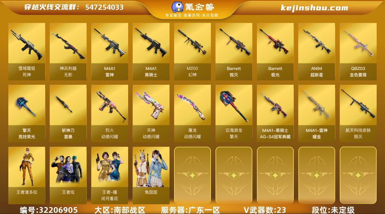广东一区-30V-1王者武器数-0炫金武器数 【热门武器】:QBZ03-金色蔷薇,M200-幻神,M4A1-黑骑士 【音效卡】:烈火-动感闪耀 音效卡,M4A1-黑骑士音效卡,Barrett-毁灭音效卡,Barrett-极光音效卡,死神-雪域霜狐-怀旧音效卡 【皮肤】:幻神-冠军之幻,幻神-宠儿-2021MVP,QBZ03-巅峰荣耀皮肤,雷神-耀金皮肤,雷神-宇航兔皮肤,雷神-动感闪耀 皮肤,毁灭-航天科技皮肤,毁灭-虹光风暴 皮肤,毁灭-英雄计划 皮肤,黑骑士-AG-S4冠军典藏 【角色】:战地猎狐,王者-瞳-闭月羞花,王者炫,王者潘多拉,雪域霜狐,乔伊教练,暗夜-X,飞虎队-X,风暴女,嘉年华灵狐,娟娟,灵狐者-X,灵狐者-黄金海岸,麻雀,潘多拉-X,潘多拉-甜心教官,斯沃特-X,蜀雪,兔囡囡,五号兵器-赛博朋克,新娜塔莎,影武者-X,游珑儿 【人偶武器】:AWM-灵狐-15周年嘉年华,迷你波特博士 【暴走生化】:超级对讲机 【挑战大师】:冰龙粉碎者-白马银枪,神圣爆裂者-末日III 【英雄级武器】:M4A1-雷神,M4A1-黑骑士,AN94-超新星,无影-神兵利器,死神-雪域霜狐,QBZ03-金色蔷薇,烈火-动感闪耀,Barrett-毁灭,Barrett-极光,M200-幻神,王者风神-觉醒版,天神-动感闪耀,擎天-竞技荣光,屠龙-动感闪耀,擎天-云海游龙,斩神刀-雷暴,高爆手雷-雷暴,高爆手雷-竞技荣光,手雷-动感闪耀,闪光弹-雷暴,闪光弹-竞技荣光,闪光弹-云龙,烟雾弹-雷暴,烟雾弹-竞技荣光,AK47-竞魂无影 【源级武器】:源·雷神,魂·雷神-神秘按键,魂·雷神-新春神龙,源·黑骑士,魂·龙血-锋芒破茧,金色蔷薇-狼王,AWM-裁决-百城联赛天津,源·毁灭,魂·Barrett-朱雀-锦鲤,魂·炼狱-月,加特林-炼狱-掌火,魂·屠龙-都是Cfer,魂·龙啸-秦师,魂·麒麟刺-月 【道具】:超级背包,雪域霜狐炫彩背包,救世主-黑桃战神,绿色巨人,灵魂忍者,迷雾幽灵,夺命之镰,防化服*2...