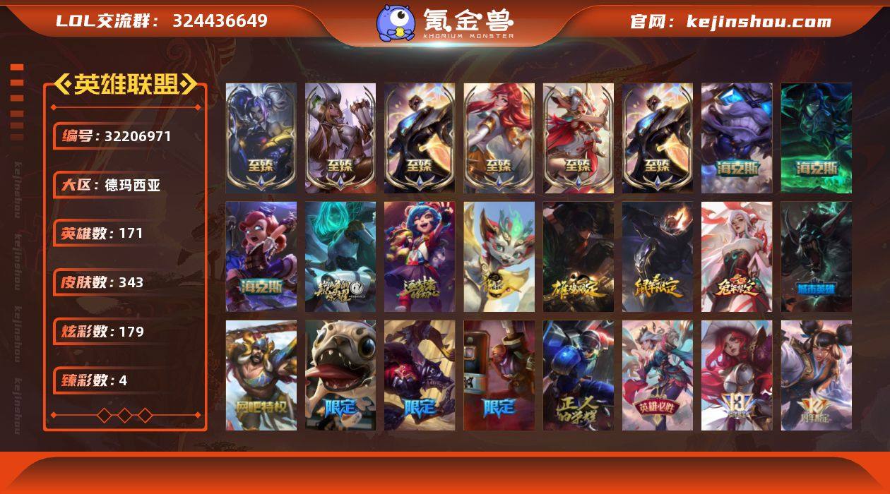 【LOLF2806】171英雄/343皮肤/11神话/45限定/4臻彩/179炫彩/45传说/65史诗/铂金/10周年 安妮/源代码 乐芙兰/海克斯 安妮/海克斯 吉格斯/摄魂 薇恩/至臻 魅惑女巫 厄运小姐/至臻 神凰行者 烈羽焰凰 霞/至臻 未来战士 锤石/至臻 未来战士 锤石(2022)/至臻 战斗学院 拉克丝/至臻 魔域梦魇 泽丽/无畏骑士 瑟庄妮 赤子初心/神龙尊者 圣龙李青 龙腾云起/星之守护者 金克丝 黑洞/可爱可爱粉红红 布里茨/虎痴之拳 蔚/王国机神青龙 德莱文/剪纸仙灵 艾瑞莉娅/天龙之子 斯莫德/水晶玫瑰 阿克尚/圣诞开心鬼 提莫/“主人不要我了” 阿木木/冰雪节 茂凯/魄罗骑士 瑟庄妮/圣诞老人 德莱文/S1FNC 酒桶/S1FNC 库奇/S3 SKT T1 劫/S3 SKT T1 李青/S3 SKT T1 薇恩/S4 SSW 锤石/S6 SKT T1 奥拉夫/S7 SSG 纳尔/S7 SSG 塔利亚/SSG霞/S8 IG 卡莎/S9 FPX 普朗克/12周年 泽丽/女帝 厄运小姐/胜利枪神 格雷福斯/胜利女神 奥莉安娜/胜利之剑 亚托克斯/胜利枪神 卢锡安/胜利机器人 布里茨/胜利女神 瑟庄妮/胜利凤凰 艾尼维亚/胜利之王 泰达米尔/胜利巨口 克格莫/胜利女神 娑娜/胜利剑圣 易/泳池派对 布隆/泳池派对 李青/暗影 沃里克/野兽猎人 泰达米尔/都铎王朝 图奇/玉剑传说 翼剑仙/防暴士兵 辛吉德/防暴天使 凯尔/海之歌 泽丽/克格汪/魔幻卡牌 崔斯特/战地机甲 厄加特/血石领主 弗拉基米尔/钢铁之翼 凯尔/源计划:林 易/提莫:"约德尔人的一大步"/约德尔国队长 提莫/驯龙炮手 崔丝塔娜/合金巨兽 努努和威朗普/幻灵战斗队长 厄运小姐/女皇 艾希/源计划:联合 艾希/鬼魂新娘 莫甘娜/双重冰晶 艾尼维亚/花仙女王 卡尔玛/未来战士 凯特琳/战斗学院 凯特琳/陆地王者4WD 布里茨/女帝 卡特琳娜/上古战魂 魔腾/神拳 李青/神龙尊者 圣龙李青/光明哨兵 薇恩/第三类接触 黑默丁格/屠龙勇士 潘森/青花瓷 伊泽瑞尔/星之守护者 阿卡丽/黎明使者 锐雯/星之守护...
