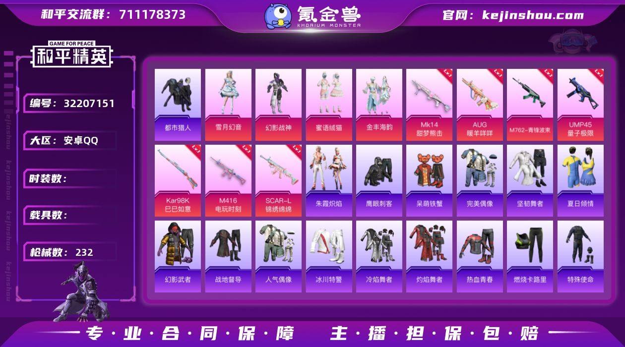 c25954-【可二次】【因赛季更新游戏段付以上号为准!】 安卓Q-1稀有4粉装13特效枪8热门161套装232枪皮7印记 历史传奇王牌11星 【1稀有】 都市猎人 【4粉装】 蜜语绒猫 雪月幻音 金丰海韵 幻影战神 【12特效枪】 SCAR-L-锦绣绵绵 (5级) M416-电玩时刻 (5级) Kar98K-巳巳如意 (5级) M762-青锋波束 (5级) DP-28-豹影疾电 (5级) AUG-暖羊咩咩 (5级) UMP45-量子极限 (5级) Mk14-甜梦熊击 (5级) AKS-74U-森灵之息 (5级) Mk14-福马献瑞 (5级) AA12-G-萌骑幻想 (5级) ACE32-萌骑漫游 (1级) 【8热门】 龟仙人 呆萌铁蟹 鹰眼刺客 AG战队服 漫步者 破蛋小黄鸡 极速红龙 弄潮海豚 【1背包】 深海小丑鱼背包