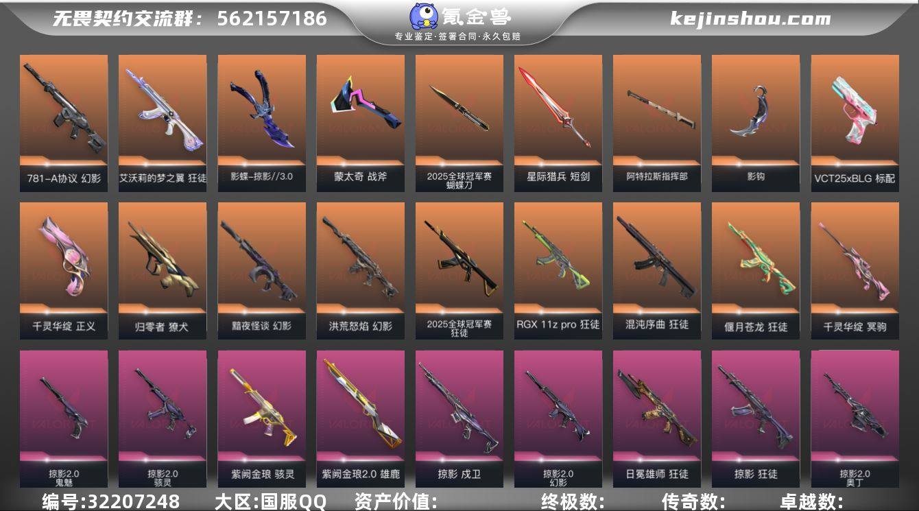 段位: 钻石 套装: 掠影2.0套装,2025全球冠军赛,掠影//3.0套装 近战武器皮肤: 阿特拉斯指挥部,影钩-掠影2.0,星际猎兵 短剑,2025全球冠军赛 蝴蝶刀,蒙太奇 战斧,影蝶-掠影//3.0 步枪皮肤: 狂徒-偃月苍龙,獠犬-归零者,幻影-781-A协议,幻影-洪荒怒焰,狂徒-日冕雄师,狂徒-艾沃莉的梦之翼,狂徒-混沌序曲,幻影-黯夜怪谈,狂徒-掠影,戍卫-掠影,狂徒-RGX 11z pro,幻影-掠影2.0,2025全球冠军赛 狂徒,超集系统 狂徒,蒙太奇 幻影,风暴之子 戍卫 佩枪皮肤: 正义-千灵华绽,标配-VCT25xBLG,鬼魅-掠影2.0,超集系统 标配,风暴之子 正义,蒙太奇 狂怒 狙击枪皮肤: 冥驹-千灵华绽,风暴之子 冥驹,超集系统 飞将 冲锋枪皮肤: 骇灵-紫阙金琅,骇灵-掠影2.0,蒙太奇 骇灵 霰弹枪皮肤: 雄鹿-紫阙金琅2.0,风暴之子 雄鹿 机枪皮肤: 奥丁-掠影2.0,蒙太奇 战神