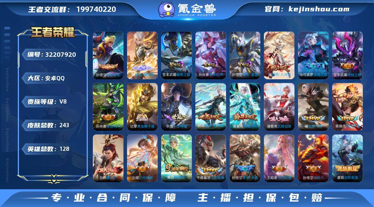 V8 2典藏 23传说 1星元 297皮肤 124英雄 【2水晶】孙悟空-全息碎影,韩信-弑枪猎影【23传说】马可波罗-深海之息,孙策-挚爱之约,达摩-黄金狮子座,貂蝉-猫影幻舞,干将莫邪-久胜战神,宫本武藏-地狱之眼,关羽-武圣,后羿-黄金射手座,镜-炽阳神光,铠-绛天战甲,李信-一念神魔,刘备-时之恋人,梦奇-胖达荣荣,孙策-末日机甲,孙尚香-末日机甲,孙悟空-地狱火,虞姬-启明星使,赵云-淬星耀世,露娜-霜月吟,曜-云鹰飞将,桑启-鸣野蒿,裴擒虎-祥瑞亨通,澜-愿照·九州拓【1星元】孙悟空-幽冥火【83史诗】墨子-降魔,元歌-无心,鬼谷子-五谷丰年,赵云-未来纪元,钟无艳-超时空战士,鲁班大师-匿光启智者,狂铁-电玩高手,澜-赏金猎手,阿轲-暗夜猫娘,阿轲-节奏热浪,安琪拉-心灵骇客,白起-星夜王子,百里守约-特工魅影,百里玄策-原初追逐者,不知火舞-魅语,蔡文姬-舞动绿茵,曹操-幽灵船长,程咬金-功夫厨神,妲己-女仆咖啡,妲己-魅力维加斯,大乔-猫狗日记,狄仁杰-魔术师,狄仁杰-鹰眼统帅,典韦-蓝屏警告,典韦-岱宗,貂蝉-圣诞恋歌,伽罗-箭羽风息,宫本武藏-鬼剑武藏,韩信-白龙吟,韩信-逐梦之影,韩信-傲雪梅枪,花木兰-水晶猎龙者,橘右京-修罗,铠-曙光守护者,铠-青龙志,兰陵王-暗隐猎兽者,老夫子-航海奇遇记,李元芳-逐浪之夏,廉颇-地狱岩魂,刘邦-德古拉伯爵,刘禅-绅士熊喵,刘禅-天才门将,露娜-紫霞仙子,鲁班七号-电玩小子,吕布-圣诞狂欢,吕布-末日机甲,马可波罗-暗影游猎,蒙犽-狂想玩偶喵,米莱狄-胡桃异想国,墨子-金属风暴,墨子-龙骑士,娜可露露-晚萤,裴擒虎-李小龙,沈梦溪-月团寄思,孙策-猫狗日记,孙尚香-水果甜心,孙尚香-蔷薇恋人,王昭君-偶像歌手,夏侯惇-乘风破浪,小乔-缤纷独角兽,雅典娜-冰冠公主,雅典娜-黎明之约,亚瑟-心灵战警,杨戬-天秀·启明,嬴政-摇滚巨星,嬴政-暗夜贵公子,元歌-云间偶戏,云中君-纤云弄巧,张飞-乱世虎臣,赵云-皇家上将,甄姬-冰雪圆...