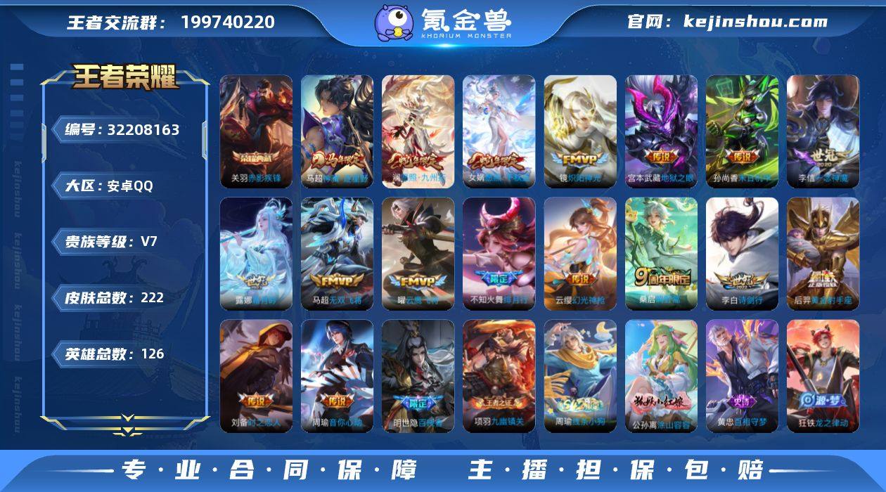 【mwz241】安卓Q-V7-最强王者段位-126英雄-222皮肤-1典藏皮肤-17传说-63史诗 【英雄全皮】:孙权全皮,戈娅全皮 【荣耀典藏】:关羽赤影疾锋 【传说皮肤】:马超神骥逐星野,女娲愿照千秋盛,澜愿照九州拓,云缨幻光神枪,桑启鸣野蒿,露娜霜月吟,李白诗剑行,不知火舞绯月行,马超无双飞将,周瑜音你心动,镜炽阳神光,曜云鹰飞将,李信一念神魔,刘备时之恋人,后羿黄金射手座,孙尚香末日机甲,宫本武藏地狱之眼 【限定皮肤】:蒙犽顽岩魄,姜子牙天穹之誓,杨戬破阵退雄兵,狄仁杰阴阳师,赵云皇家上将,元歌无心,狄仁杰魔术师,项羽海滩派对,不知火舞绯月行,孙悟空孙行者,雅典娜黎明之约,百里玄策原初追逐者,裴擒虎擒涛扼浪,云中君纤云弄巧,嫦娥拒霜思,鲁班大师探海日志,戈娅驭风魔法,阿古朵江河有灵,张良古海寻踪,蒙犽百解令,鬼谷子天穹祈灯,姬小满妄想食味,沈梦溪龙舞盛年,刘邦剑破天穹,上官婉儿群星魔术团,程咬金群星魔术团,镜青焰无极,项羽苍威无极,周瑜熔金海岸 【年限皮肤】:女娲愿照千秋盛,澜愿照九州拓 【赛季限定】:裴擒虎擒涛扼浪,鲁班大师探海日志,张良古海寻踪,鬼谷子天穹祈灯,刘邦剑破天穹,姜子牙天穹之誓,东皇太一噬灭天穹,太乙真人谧流熔炉,钟馗虚灵犬护,甄姬逆浪荇歌,亚瑟荣光之誓,百里玄策原初追逐者,雅典娜黎明之约,牛魔星界战将,项羽九幽镇关 【战令限定】:戈娅驭风魔法,镜青焰无极,项羽苍威无极,亚连破空之剑,孙悟空神迹守卫,周瑜线条小狗 【史诗皮肤】:明世隐百晓客,周瑜线条小狗,项羽九幽镇关,公孙离涂山容容,黄忠百相守梦,扁鹊灵蛊蚀心,狂铁龙之律动,阿轲化蝶舞,赵怀真器灵浮梦炉,弈星万物之道,牛魔星界战将,亚连破空之剑,蒙犽顽岩魄,黄忠怒海争锋,明世隐夜落电台,镜青焰无极,上官婉儿群星魔术团,姬小满妄想食味,...