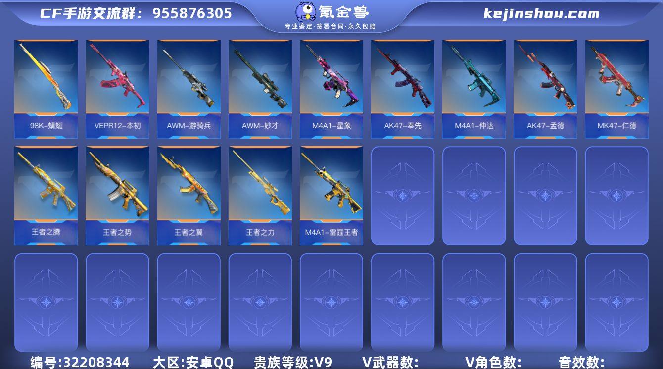 实名: 不可修改 v武器数: 196 王者武器数: 6 V/王者角色数量: 9 音效卡数: 5 v武器: AK47-风神翼龙,M4A1-运输船,AK47-死神,AK47-华夏传说,M4A1-心动次元觉醒,81式-光明之神,M4A1-海骑士,AK47-血武士,M4A1-赛博雷神,AK47-雷麒麟,AK47-心动次元觉醒,HK416-混世行者,AK47-沙漠郡主-二觉,AK47-猩红传说,QBZ03-死神,AK47-幸运日觉醒,AK47-天使,QBZ19-天使,AUG-机械纪元,9A91-游骑兵,AK47-亚龙,M4A1-龙血,AK47-竞技战魂,AK47-机械迷城,AK47-樱斗士-超觉,SCAR-幽暗骑士觉醒,QBZ03-金色蔷薇,M4A1-樱龙·二觉,M4A1-竞技战魂,M4A1-武圣,AN94-超新星,QBZ03-湮灭,AK12-天启,SCAR-幽暗骑士,M4A1-天使,M4A1-玫瑰精灵,AK47-黑武士觉醒,M4A1-死神,M4A1-黑龙,M4A1-黑骑士,M4A1-雷神,AK47-火麒麟,AK47-无影,巴雷特-冬灭觉醒,M200-心动次元觉醒,巴雷特-雷霆,MR1-龙吟惊沧海,AWM-天使,98K-黑骑士,AWM-裁决,巴雷特-金色蔷薇,09式狙-天神,暗杀神,巴雷特-极光,巴雷特-毁灭,加特林-蟒蛇,加特林-堡垒觉醒,加特林-堡垒,RPK-赤炎盘龙,CZS2-心动次元觉醒,CZS2-善财童子,M12S-雷霆,MK5-极光,斯泰尔-恶魔,双持斯泰尔-天使,寒霜烈龙,毁灭征服者-超越Max,KSG-天蓬元帅,地狱烈樱·超觉,地狱烈炎,嗜血金鲨,地狱火,MAC-10-风神翼龙,柯尔特-仲达,USP-机械迷城,QSZ92-天使,气手枪-炼狱,双持沙鹰-亚龙,QSZ92-金色蔷薇,改装GLOCK-黑龙,双管猎枪-黑骑士,沙鹰-无影,沙鹰-天神,左轮-黑武士觉醒,USP-神罚,沙鹰-飞电,唐刀-大唐荣耀,手斧-机械迷城,迷你究极泰坦,镰刀-哈迪斯,墨刃-幻神,尼泊尔-铜头铁臂,麒麟刺-堕天神,尼泊尔-机械纪元,白骨利刃,双截棍-天使,双持尼泊尔-亚龙,黄沙残魂剑,双截棍-金色蔷薇,黑龙刺,激光短刃-黑骑士,血月,斩魔刀,战斧-无影,星芒,擎天觉醒,麒麟刺,斩魔剑-天使,神罚战斧,马来剑-毁灭,龙啸,屠龙,CZ75-穷奇,M4A1-堕天神,迷你饕餮,KSG-极光,双持沙鹰-雷麒麟,M1216-血月,QCW05-变形金刚·大黄蜂,双脊龙趾,P90-双脊龙,MK23-双脊龙,改装GLOCK-木兰,QBB95-极光,秋逸,PP19野牛-造纸术,SCAR-守护者觉醒,PP19野牛-造纸术觉醒,方天画戟,M4A1-猎神,SCAR-探星者,QSZ92-华夏传说,迷你玉凝,M14EBR-拂影,09式狙-魔音长歌觉醒,QBZ03-玉面羞花,SCAR-印刷术,沙鹰-神兵修罗,M16-恶魔,QBB95-再战涿鹿,蝴蝶刀-天神,AK47-春雅,AK47-木兰,M4A1-夏清觉醒,百战巾帼枪,沙鹰-修罗-现代金属 王者武器: 王者之影,王者之心,王者之狱,王者之魂 v角色: 职场灵狐-赛事经理,关小雨,樱,幽灵刀锋-觉醒,萝拉,蜀雪,云悠悠-心动起点,秦师 枪械皮肤: AK47-雷麒麟-火锅,HK416-混世行者-千变,M4A1-游骑兵-紫魇,左轮-黑武士觉醒-Continue,M4A1-死神-不屈老兵,巴雷特-毁灭-星空,巴雷特-毁灭-不屈老兵,巴雷特-极光-荣耀街寂,巴雷特-极光-重型机甲,AWM-天龙-英雄战甲,AK47-竞技战魂-瑞财,AK47-血武士-甲骨文渊