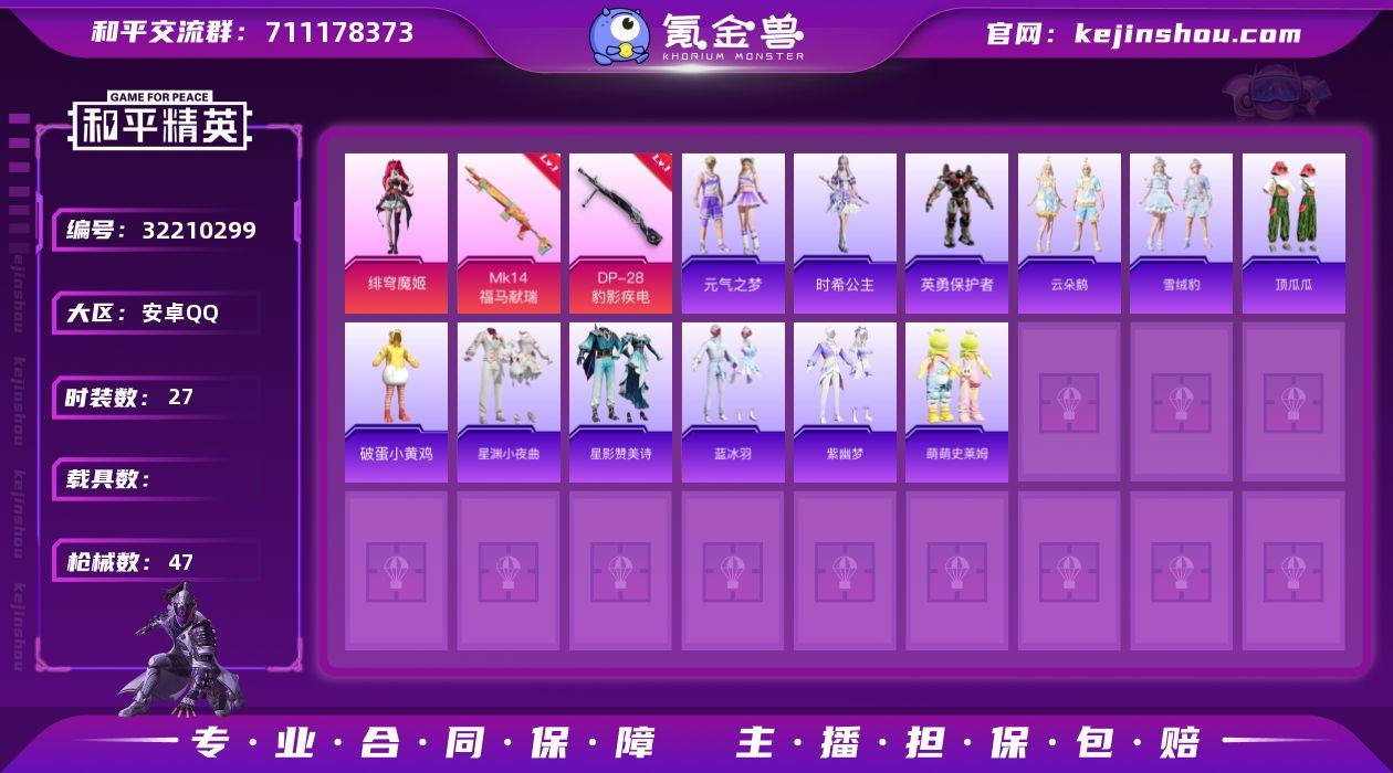 M1046782安卓手Q-1粉装-2特效枪-27套装-47枪皮-1王牌印记-坚韧铂金Ⅲ-11266热力值【1粉装】角色-绯穹魔姬【2特效枪】DP-28-豹影疾电[5级],Mk14-福马献瑞[1级]【1飞行器】破刃行动尾迹【71其它衣服和枪皮】萌萌史莱姆,云朵鹅,黄色名流,黄色伏地魔,星渊小夜曲,SS35特训,SS33特训,顶瓜瓜,白色伏地魔,SS34特训,破蛋小黄鸡,雪绒豹,SS36特训,SS37特训,紫幽梦,酒红色名流,星影赞美诗,SS32特训,潮流炫酷,角色-英勇保护者,福马献瑞,暗金炫舞,蓝冰羽,元气之梦,狙击之神,角色-时希公主,沙漠之鹰-云朵鹅,DBS-幻彩电音,UZI-炫彩节奏,SCAR-L-玉兔迎春,GROZA-福马献瑞,P1911-无面战甲,S12K-玩趣呆呆,PKM-紫幽梦,破片手榴弹-海盐豹豹,破片手榴弹-拽到爆炸,SVD-云朵鹅,S1897-紫幽梦,AKM-破晓战魂,TMP-9-萌萌史莱姆,M249-糯团青竹,大砍刀-云朵鹅,Mk14-紫幽梦,AUG-异域银装,M249-无面战甲,UMP45-海盐豹豹,SPAS-12-云朵鹅,M762-云朵鹅,SVD-冷漠罗丽,MG3-幻世战舞者,爆炸猎弓-雪月幻音,M416-萌萌史莱姆,Mk14-薄荷星砂,M762-天降萌叽,M249-萌萌史莱姆,P92-紫幽梦,SKS-炫彩节奏,S686-雪月幻音,蝎式手枪-六号稻草人,平底锅-紫幽梦,MG-36-薄荷星砂,UZI-啾咪啾咪,短管霰弹-星穹咏叹调,烟雾弹-冰氧夏日,SCA...