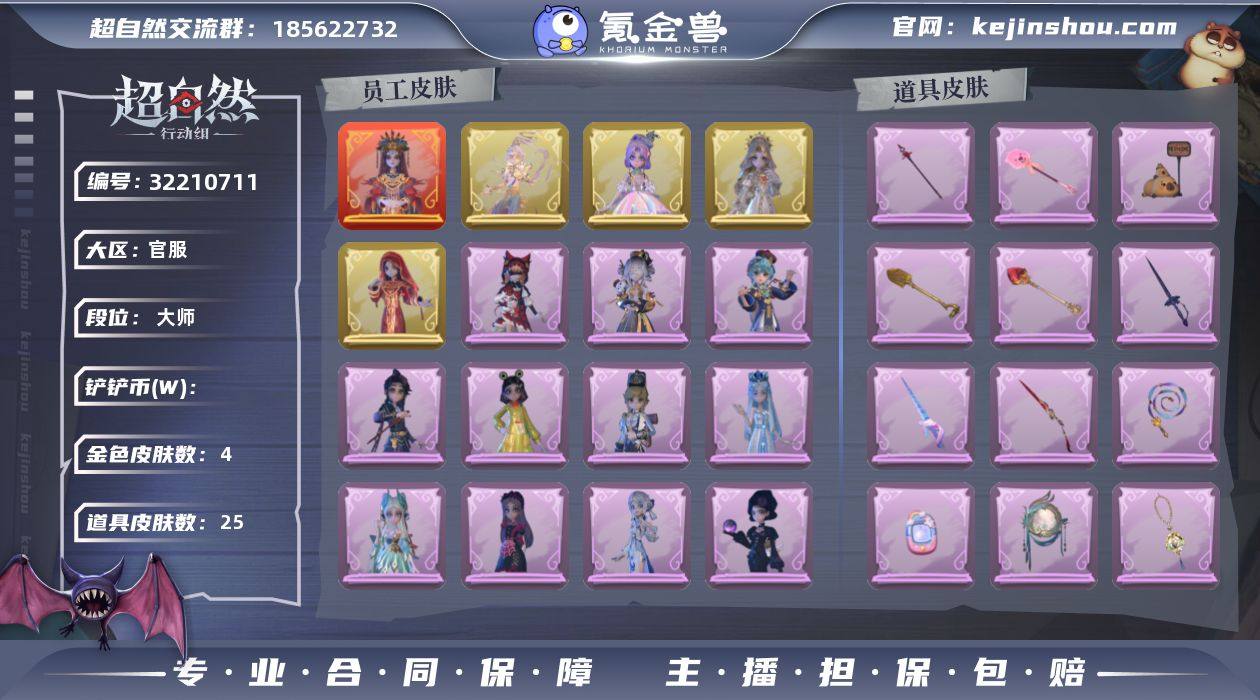 [16729042]1红皮 4金皮 13紫皮 月下莲台,赞萌露比水枪,珍珠芭乐莓莓,赞萌波板糖,罪棘,惊魂娃娃,紫霄,龙鳞,圣心之泪,永眠曲,最后的独角兽,凤鸣九天,小狗蛇点点鞭,幻宠之门,昆仑镜,花落精绝,祝祷词,宝剑八,飞天绫,星光的裁决,云端梦想计划,青玉抱丹,飞花令,金丝眼镜,卡皮巴拉小黄豚铲道具 带你逃跑吧,律动迪斯科,旋转舞,山楂树之舞,刀马舞,鸳鸯戏,要糖,抬手,KT猫摇,举牌,luvaboy,人皇步,姫芽揺,九万字舞,伤心摇,舞台中心,心跳摇,小雨摇,DL摇,鹏友摇动作 10级梦居 大师 【员工】逍遥,薇薇安,巫铃儿,莉莉,阿念,艾伦,小黄,零,爱丽丝,爱德华,兰,小满 【服装】镜生遗梦,潮汐小海兔,莓果陷阱,惊魂南瓜,异色序曲,樱桃奶油布丁,莲华渡,火爆了头套,九色祥鹿,梵音莲华,小财神豚豚头套,除妖小师妹,迷途僵宝,绒团小狐狸,烈焰红唇头套,嘻嘻头套,情公主,黑月挽歌,素影瑶光,炙热烧烤,丝缕哀歌,瑞羽衔春,冰公主,王子与骑士,镜花辞,圣光之谕,遗失的童话,呆滞头套,卑微头套,绣春逍影,呱呱雨衣,钗头凤,天使消失的年代,未竟乐园,小鲨包包,蝶恋花,在逃小新娘,天使的呼唤,毛球夹子,哈士奇头套,云梦之星,小狗蛇点点头套,驼半仙头套,萨卡班甲鱼头套,面具马头套,鱼头怪头套,鳄霸天头套,滑稽头套 【道具】...